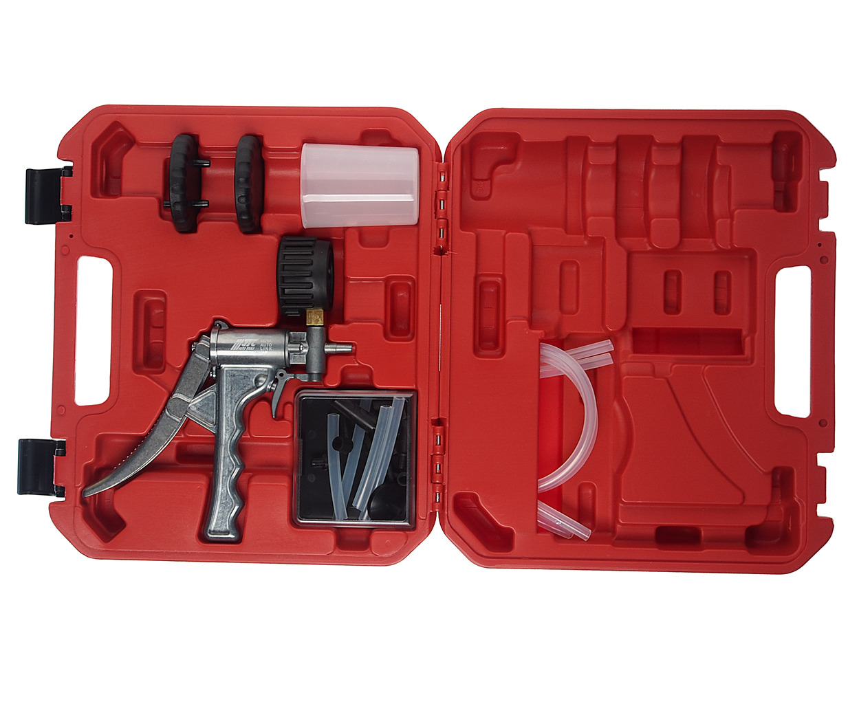 • Вакуумный ручной насос Стакан-накопитель Рабочая крышка Крышка-заглушка 4 гибкие трубки 1/2" 1 гибкая трубка 5/32 Адаптер для выпуска воздуха из тормозной системы Резиновая присоска Упаковка: прочный переносной кейс