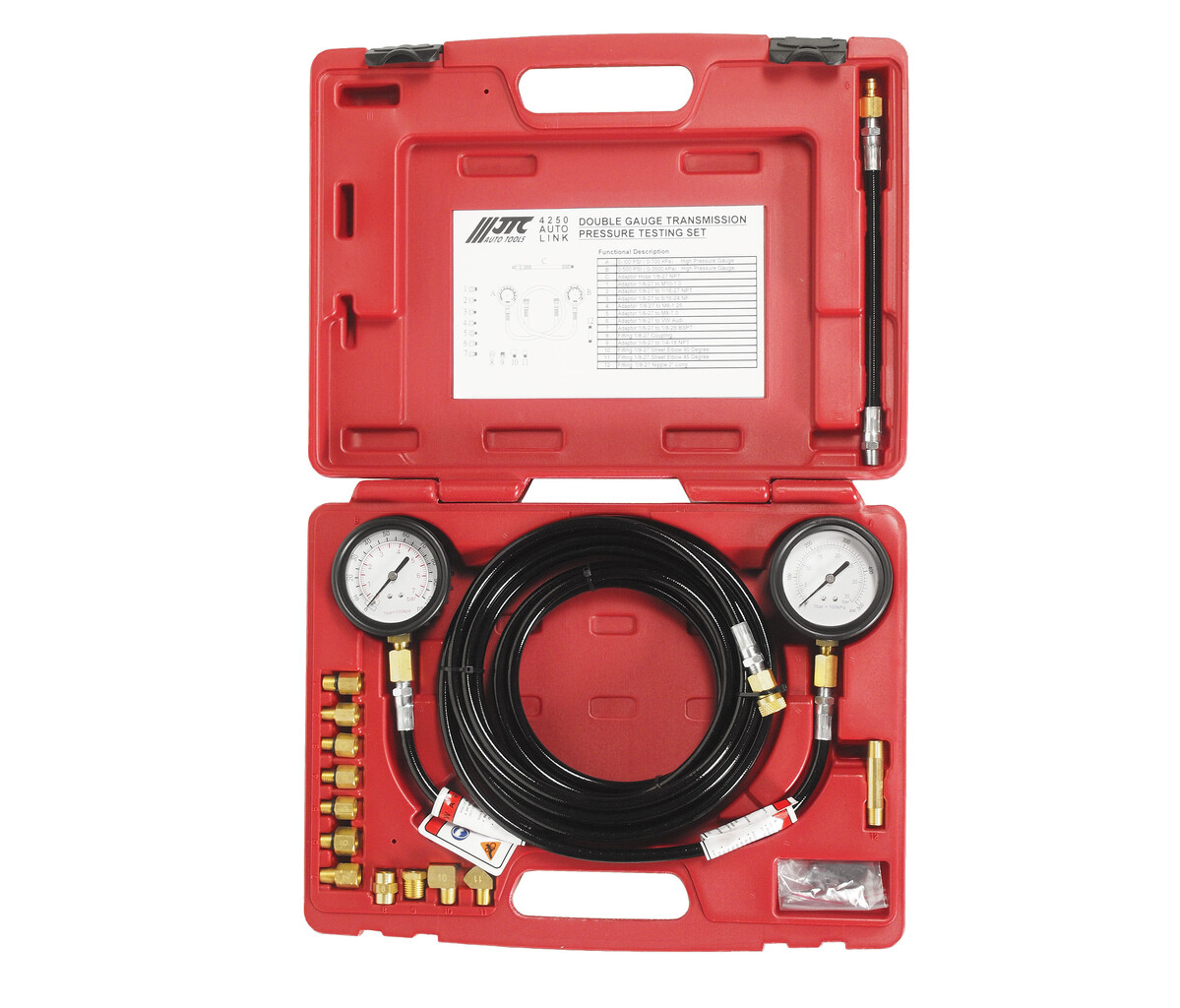 Большой ассортимент адаптеров и два манометра позволяют проводить тестирование для большинства КПП различных марок автомобилей.