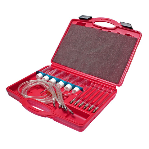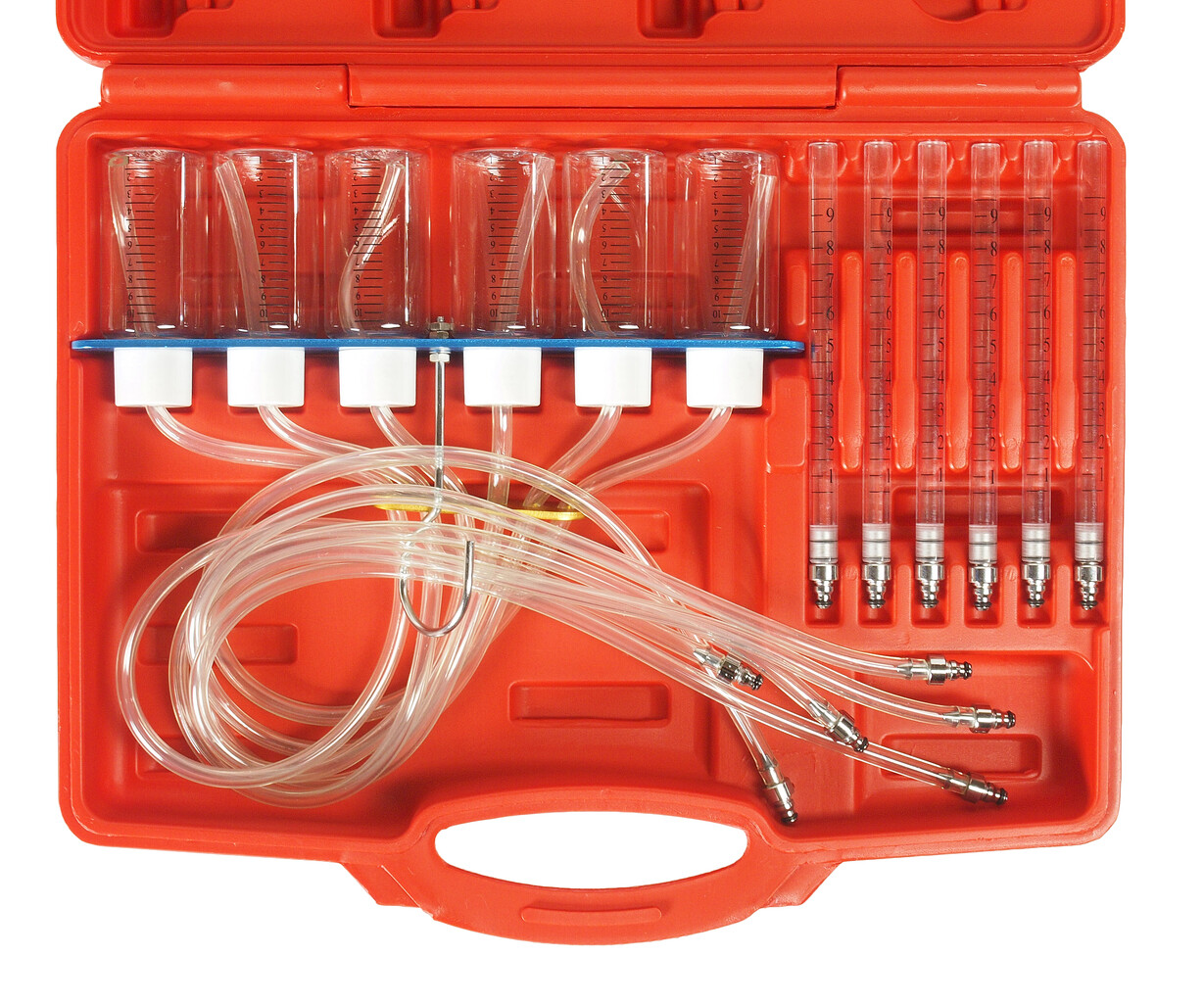 Тестер позволяет проводить статический и динамический тесты и увидеть объем перелива каждой из форсунок в прозрачной калиброванной мензурке или колбе, что позволяет быстро и легко определить неисправную форсунку.