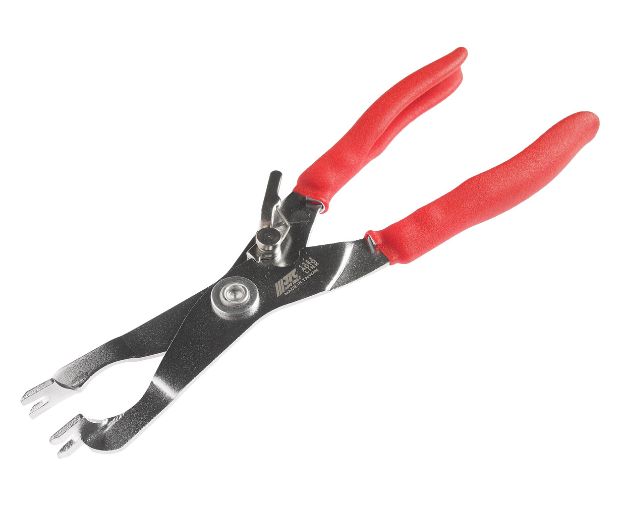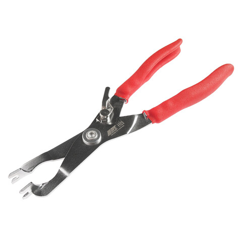 Передняя часть инструмента имеет выемку, которая плотно захватывает трос и фиксирует его, с помощью язычка, расположенного на ручке клещей.