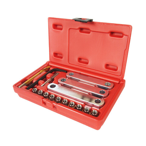 Применение данного набора обеспечивает быстрое восстановление поврежденной резьбы при помощи специальных приспособлений.
