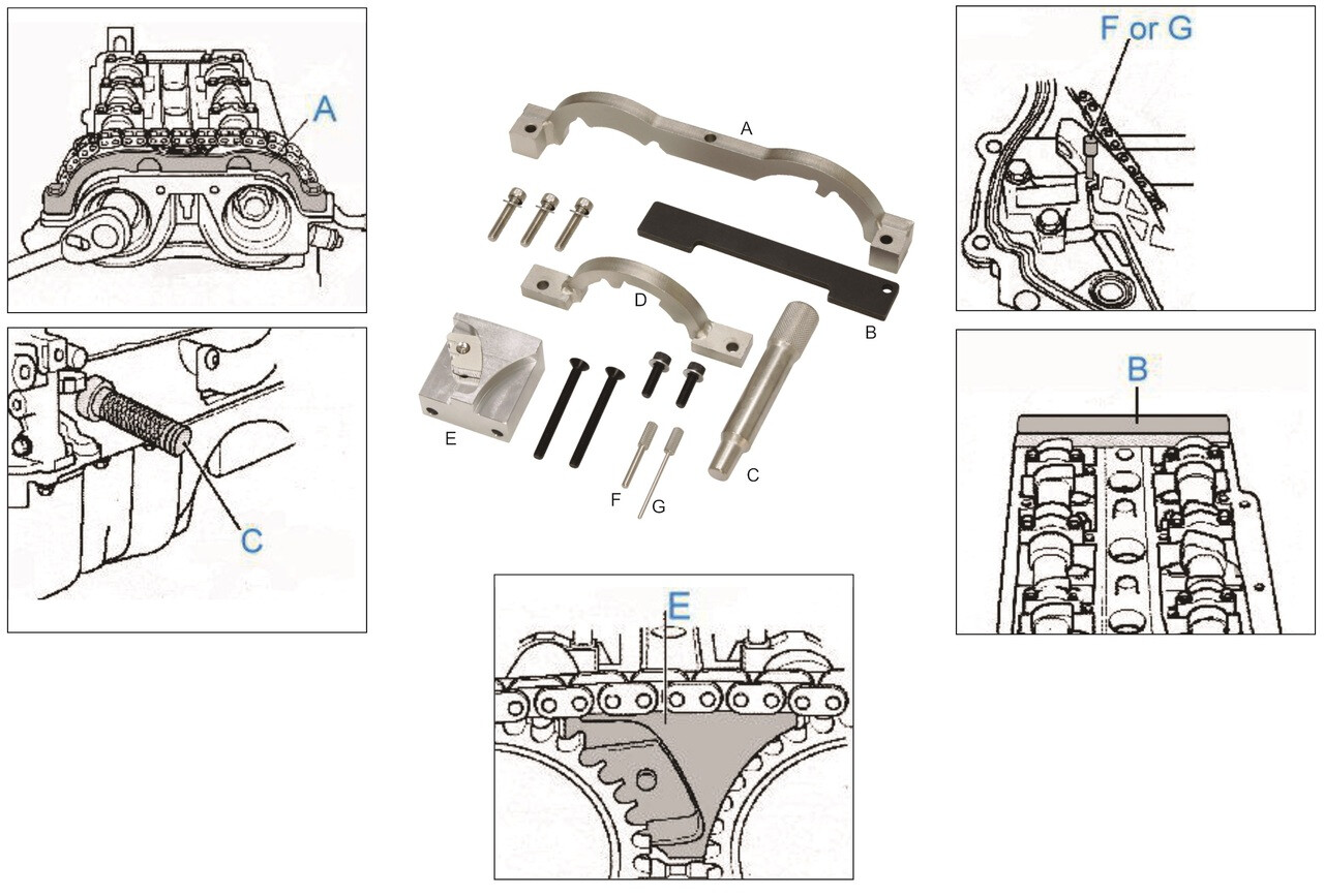 • Комплектация Фиксатор для установки задающих датчиков распредвалов EN-49977-100; Фиксатор распредвала OPEL EN-953-A / KM-953-A; Фиксатор коленвала OPEL KM 952; Фиксатор маркерного диска датчика распредвала EN-49978; Шаблон для установки положения впускного распредвала EN-49977-200; Фиксирующий штифт для натяжителя ГРМ Opel KM-955-2 (4 мм); Штифт для натяжителя KM-955-1 (2.5 мм) Описание Используется для блокировки распределительного и коленчатого валов. Применение Opel/Vauxhall/Chevrolet 1.0, 1.2, 1.4 бензиновый двигатель (цепь). Тип двигателя: 1.0: A10XEP, Ecoflex: A10XEP. 1.2: A12XEL, L2Q/ A12XEL, LWD/ A12XEL, Ecoflex: A12XER, A12XEL. 1.4: A14XEL, L2Z/ A14XEL , LDD/A14XER, A14XEL, LUJ/A14NET Ecoflex: A14XER, LDD,LUH/ A14NEL, LUJ/A14NET, LUU Turbo: LUJ/A14NEL, LUJ/A14NET.