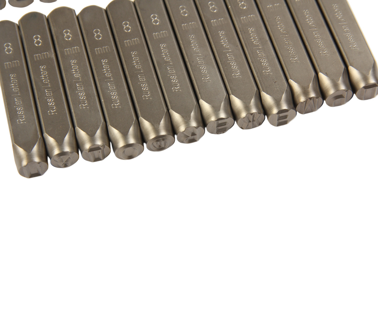 • Клейма буквенные кириллица Характеристики: Тип: кириллица Размер 8мм Твердость: 60±2HRC Материал: хромованадиевая сталь Комплектация: 36 предметов ("А-Я", "-", "&")
