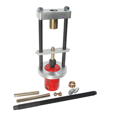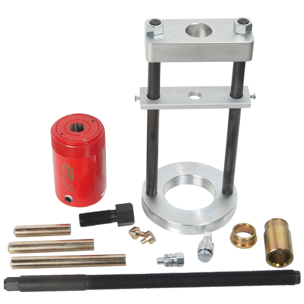 В комплекте: съемник, гидравлический цилиндр, три 22-миллиметровых насадки (4", 6" и 8"), две 1 3/8" направляющие (7/8" и 3 1/4").