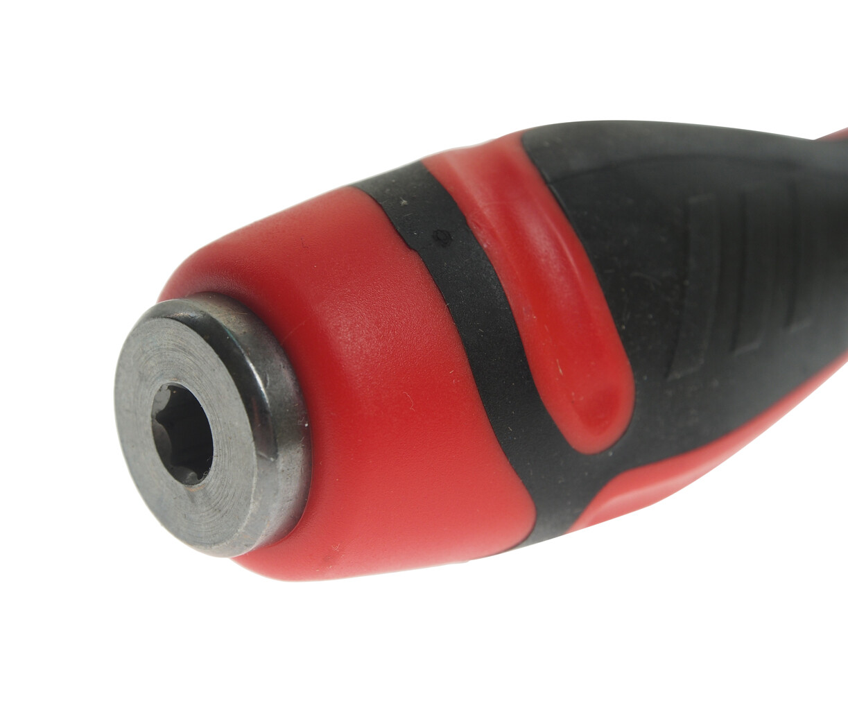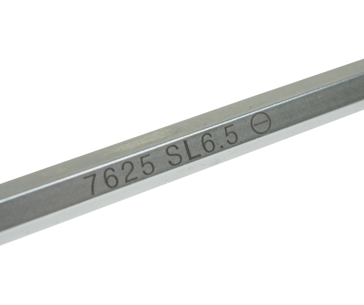 Стержень отвертки стальной, сквозной, шестигранный. Покрыт сатин-хромом, жало оксидировано.