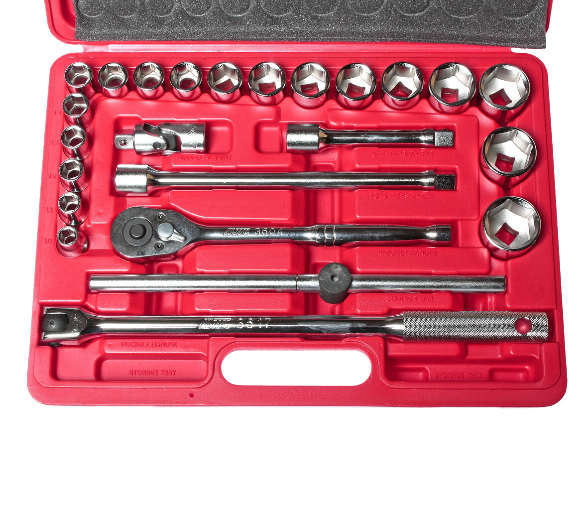 • В комплекте: 18 ед. головка 1/2": 10, 11, 12, 13, 14, 15, 16, 17, 18, 19, 21, 22, 23, 24, 27, 29, 30, 32 мм. 2 ед. удлинитель 1/2": 5", 10". 1 ед. вороток с шарниром 1/2". 1 ед. вороток с плавающей головкой 1/2". 1 ед. трещотка 1/2", 72 зуба. 1 ед. карданный переходник 1/2". Упаковка: прочный переносной кейс. Габаритные размеры: 380/300/90 мм. (Д/Ш/В) Вес: 5300 гр.