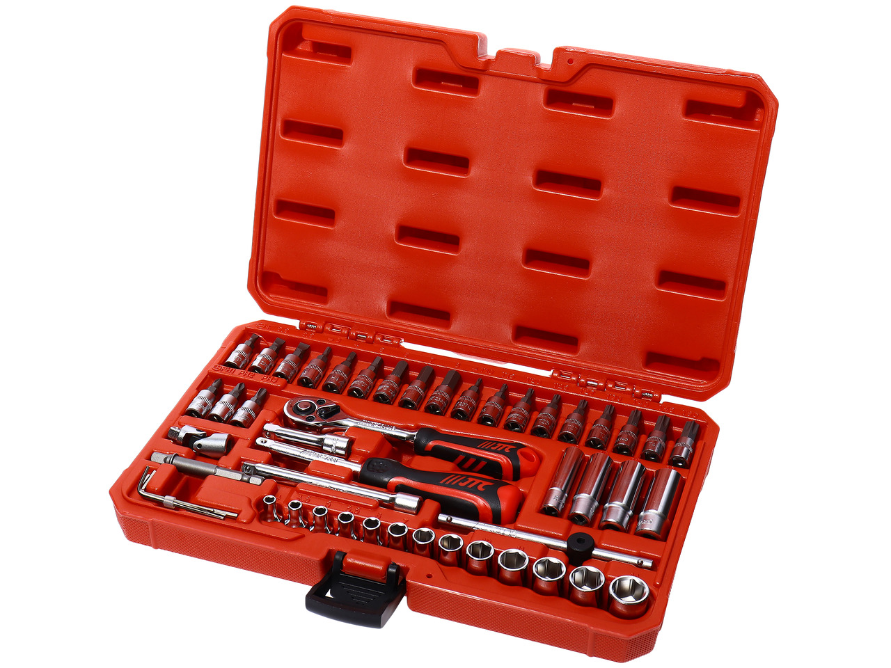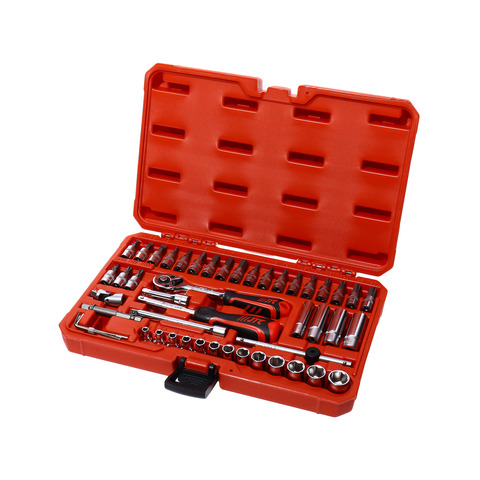 • Комплектация: 13шт 1/4" головки: 4, 4.5, 5, 5.5, 6, 7, 8, 9, 10, 11, 12, 13, 14 мм. 4шт 1/4" длинные головки: 8, 10, 12, 13 мм. 9шт 1/4" TORX: T10, T15, T20, T25, T27, T30, T40, T45, T50. 3шт 1/4" шлицевые торцевые биты: 4, 5,5, 6,5 мм. 3шт 1/4" крестообразные торцевые биты: PH1, PH2, PH3. 6шт 1/4" шестигранные торцевые биты: H3, H4, H5, H6, H7, H8. 3шт шестигранный ключ: 1.5, 2, 2.5 мм. 1шт 1/4" трещотка с мягкой рукояткой. 2шт 1/4" удлинитель: 2", 4". 1шт 1/4" вороток. 1шт 1/4" универсальный шарнир. 1шт 1/4" отвертка с мягкой рукояткой. 1шт 1/4" адаптер для торцевых головок 65L.