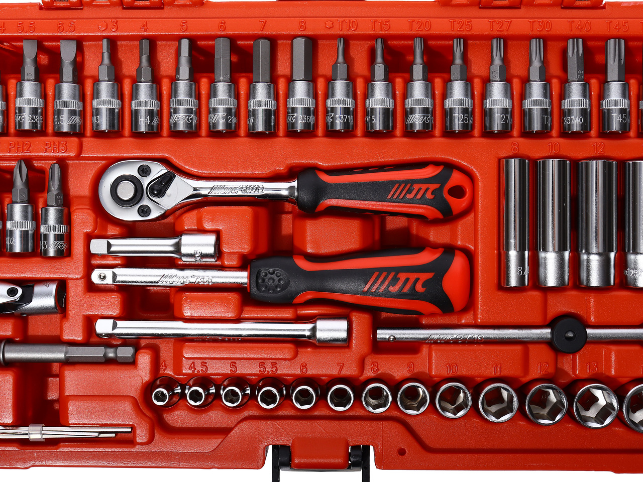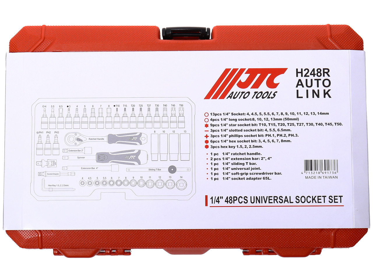Набор головок торцевых 1/4" 6-ти гранных 4-14мм и насадок 48 предметов в кейсе JTC