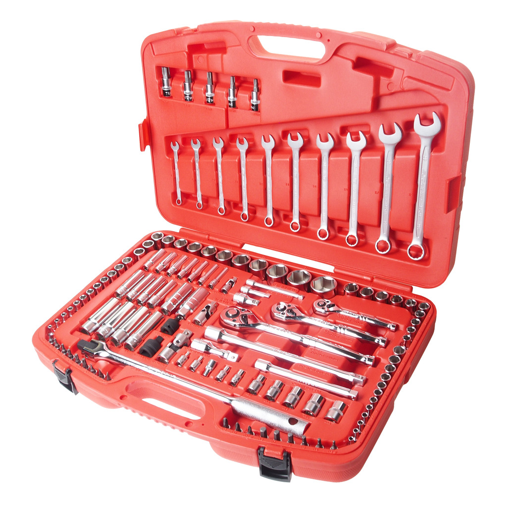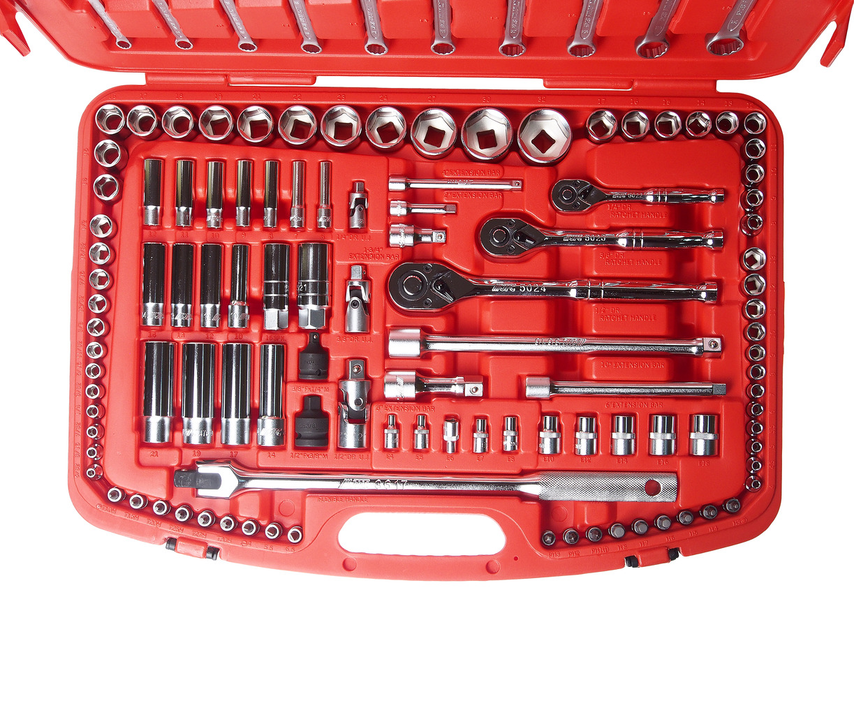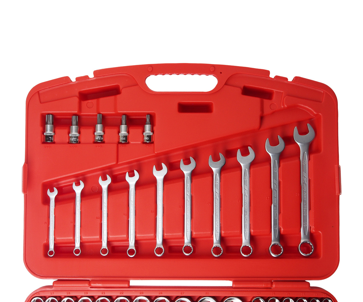 • В комплекте: 12 шт. головки ММ 1/4": 4, 4.5, 5, 5.5, 6, 7, 8, 9, 10, 11, 12, 13 мм. 12 шт. головки IN 1/4": 5/32", 3/16", 7/32", 1/4", 9/32", 5/16", 11/32", 3/8", 13/32", 7/16", 15/32", 1/2". 10 шт. головка 3/8": 8, 9, 10, 11, 12, 13, 14, 15, 16, 17 мм. 13 шт. головка 1/2": 14, 15, 16, 17, 18, 19, 21, 22, 23, 24, 27, 30, 32 мм. 7 шт. головка глубокая 1/4": 6, 7, 8, 9, 10, 11, 12 мм. 4 шт. головка глубокая 3/8": 10, 12, 13, 14 мм. 4 шт. головка глубокая: 1/2": 14, 17, 19, 21 мм. 5 шт. головка с насадкой TORX 1/4": Е4, Е5, Е6, Е7, Е8. 5 шт. головка с насадкой TORX 3/8": Е10, Е12, Е14, Е16, Е18. 6 шт. головка с насадкой TORX 1/4": Т10, Т15, Т20, Т25, Т27, Т30. 5 шт. головка с насадкой TORX 3/8": Т40, Т45, Т50, Т55, Т60. 6 шт. головка с насадкой HEX 1/4": Н3, Н4, Н5, Н6, Н7, Н8. 3шт. головка с насадкой PH 1/4": PН1, PН2, PН3. 3шт. головка с насадкой SL 1/4": 4, 5.5, 6.5 мм. 2 шт. удлинитель 1/4": 2", 4". 2 шт. удлинитель 3/8": 1-3/4", 6". 2 шт. удлинитель 1/2": 3", 10". 2 шт. головка для свечей зажигания 3/8": 16, 21 мм. 3 шт. трещотка: 1/4", 3/8", 1/2" Dr, 72 зуба. 3 шт. карданный переходник 1/4", 3/8", 1/2" Dr. 1 шт. вороток с шарниром 1/2" Dr. 2 шт. адаптер: 3/8"(F)х1/4"(М), 1/2"(F)х3/8"(М). 10 шт. ключ комбинированный: 8, 9, 10, 11, 12, 13, 14, 15, 17, 19 мм. Упаковка: прочный переносной кейс. Габаритные размеры: 530/370/100 мм. (Д/Ш/В) Вес: 9700 гр.