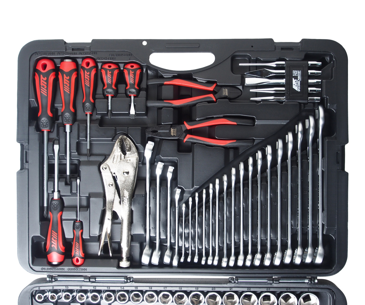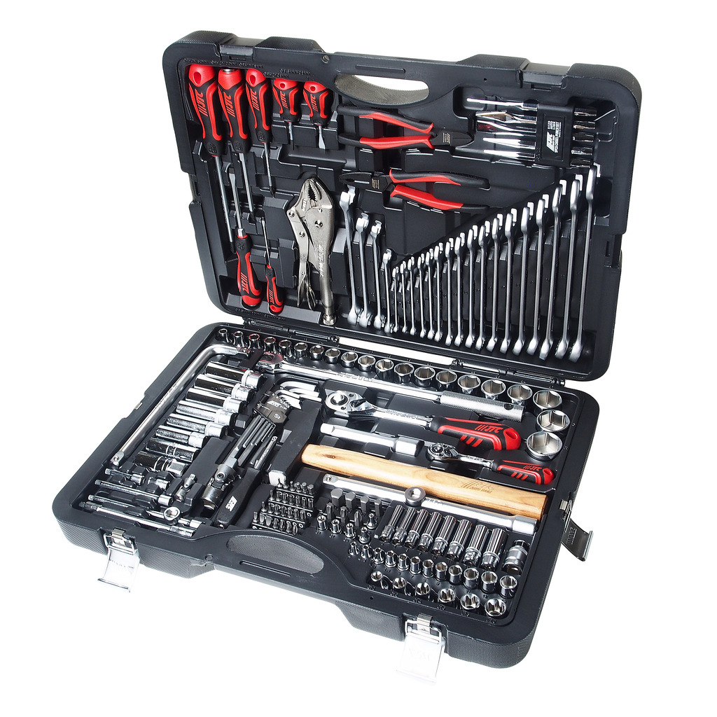 • Набор инструмента в кейсе JTC 156 предметов Описание В комплекте: 12 шт. головки 1/4" (6РТ): 4, 4.5, 5, 5.5, 6, 7, 8, 9, 10, 11, 12, 13 мм. 8 шт. головки глубокие 1/4" (6РТ): 6, 7, 8, 9, 10, 11, 12, 13 мм. 5 шт. головки TORX 1/4": Е4, Е5, Е6, Е7, Е8. 20 шт. головки 1/2" (6РТ): 8, 9, 10, 11, 12, 13, 14, 15, 16, 17, 18, 19, 20, 21, 22, 23, 24, 27, 30, 32 мм. 5 шт. головки глубокие 1/2" (6РТ): 14, 15, 17, 19, 22 мм. 6 шт. головки TORX 1/2": Е10, Е12, Е14, Е16, Е18, Е20. 1 шт. трещотка 1/4", 72 зуба. 3 шт. удлинитель 1/4", 50 мм., 100 мм., 150 мм. 1 шт. кардан 1/4". 1 шт. вороток-отвертка 1/4", 150 мм. 1 шт. удлинитель 1/4", 150 мм. 1 шт. держатель для бит 1/4". 1 шт. переходник 3/8"(F)х1/4"(М). 1 шт. свечная головка 1/2", 14 мм. (12РТ) 2 шт. свечная головка 1/2", 16 мм. (6РТ) и 21 мм. (6РТ) 1 шт. трещотка 1/2", 72 зуба. 2 шт. удлинитель 1/2", 125 мм. и 250 мм. 1 шт. кардан 1/2". 1 шт. переходник 3/8"(F)х1/2"(М). 1 шт. держатель для бит 5/16". 1 шт. вороток с шарниром 380 мм. 1 шт. вороток Г-образный 260 мм. 27 шт. биты 1/4": (S2, длина 25 мм.): 6 шт. HEX: 2, 2.5, 3, 4, 5, 6 мм. 7 шт. TORX (с отверстием): Т10Н, Т15Н, Т20Н, Т25Н, Т27Н, Т30Н, Т40Н. 7 шт. TORX: Т10, Т15, Т20, Т25, Т27, Т30, Т40. 3 шт. SL: 4, 5.5, 6.5 мм. 2 шт. PZ: PZ1, PZ2. 2 шт. РН: РН1, РН2. 7 шт. биты 5/16": (S2, длина 30 мм.): 1 шт. РН: РН3. 4 шт. HEX: 8, 10, 12, 14 мм. 2 шт. TORX: Т45, Т50. 17 шт. ключ рожково-накидной: 6, 7, 8, 9, 10, 12, 13, 14, 15, 16, 17, 18, 19, 21, 22, 24 мм. 4 шт. ключ разрезной: 8х10, 11х13, 12х14, 17х19 мм. 9 шт. Г-образный ключ HEX: 1.5, 2, 2.5, 3, 4, 5, 6, 8, 10 мм. 1 шт. пассатижи 7". 1 шт. бокорезы 6". 1 шт. клещи с фиксатором 10". 1 шт. молоток 500 г. 5 шт. набор выколоток и зубил: 1 шт. выколотка (4х9.5х150 мм.). 1 шт. коническое зубило (5х9.5х130 мм.). 1 шт. зубило (12х9.5х130 мм.). 1 шт. коническая выколотка (3х9.5х120 мм.). 1 шт. кернер (2х9.5х120 мм.) 7 шт. отвертки с антискользящей рукояткой: 4 шт. РН: РН1х75 мм., РН2х38 мм. (укороч.), РН2х100 мм. (ударная), РН3х150 мм., 3 шт. SL: 3х75 мм., 6.5х38 мм. (укороч.), 6.5х100 мм. (ударная). Упаковка: прочный переносной кейс. Габаритные размеры: 570/440/150 мм. (Д/Ш/В) Вес: 15800 г.