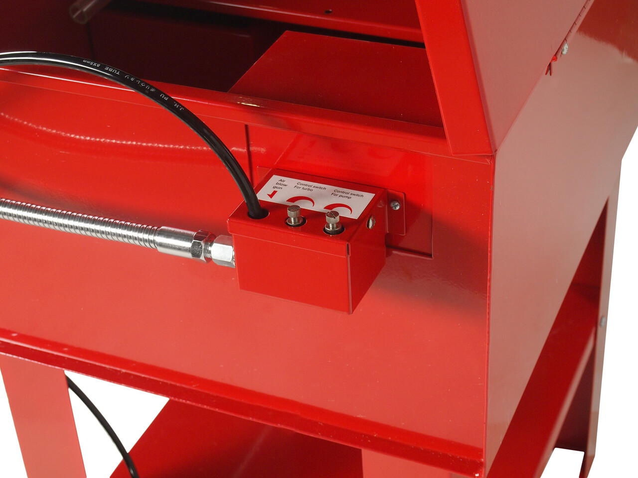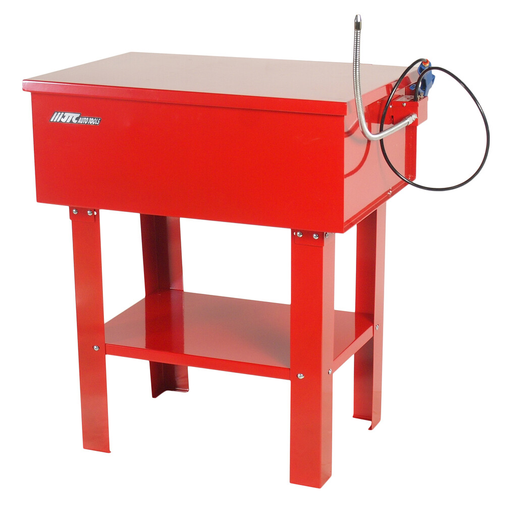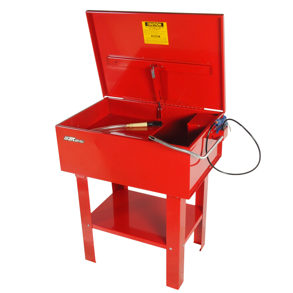 • Комплектация Крышка. Выключатель. Гибкий шланг. Бак (резервуар). Рабочая полка. Плавкий предохранитель (вставка). Стойки. Полка. Насосный узел (насос). Лоток для маленьких деталей. Описание В комплекте поставляется продувочный пистолет. Закрытый и полностью экранированный электронасос. Встроенный сменный фильтр. Самофиксирующаяся огнеупорная крышка с плавким предохранителем. Гибкие хромированные металлические шланги. Съемная полка для осмотра и сушки деталей. Отмачивание погружением при снятой полке. Цельный бак. Технические характеристики Емкость: 20 галлонов (76 л). Объем раствора: 12 галлонов (45 л). Расход: 75 галлонов/час (284 л). Максимальная скорость: 11000 об/мин. Диапазон рабочего давления: 65-125 PSI. Размер воздушного штуцера: 1/4".