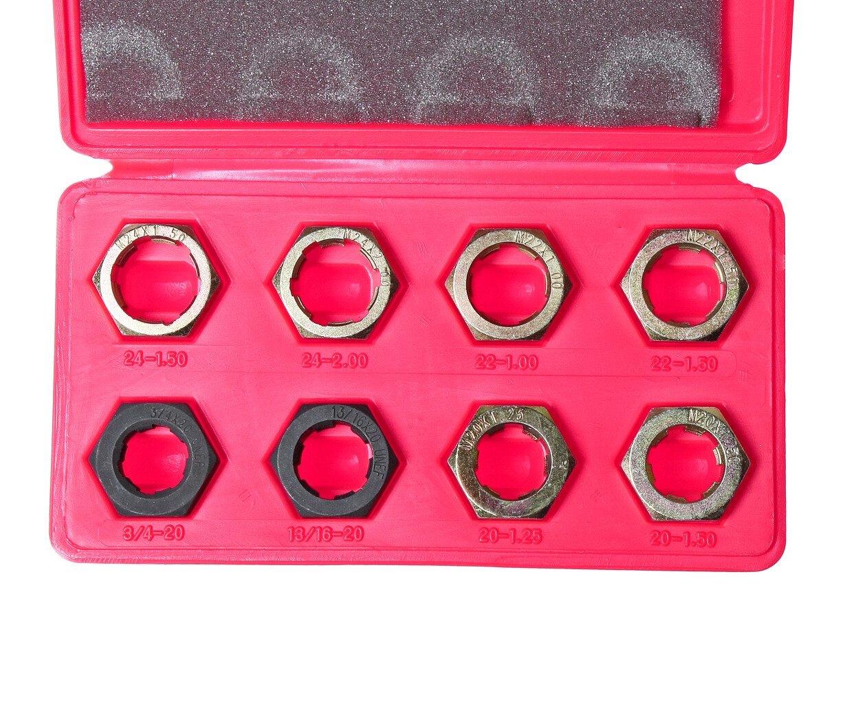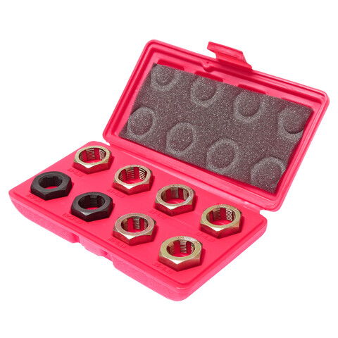В комплект входят 8 плашек, которые применяются во время работ по восстановлению резьбы шейки оси размерами М24х1.5, М24х2.0, М22х1.0, М22х1.5, М20х1.5, М20х1.25, 13/16"х20 UNEF, 3/4"х20 UNEF.