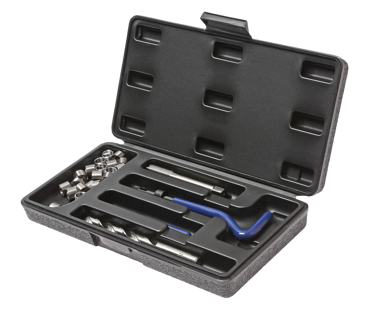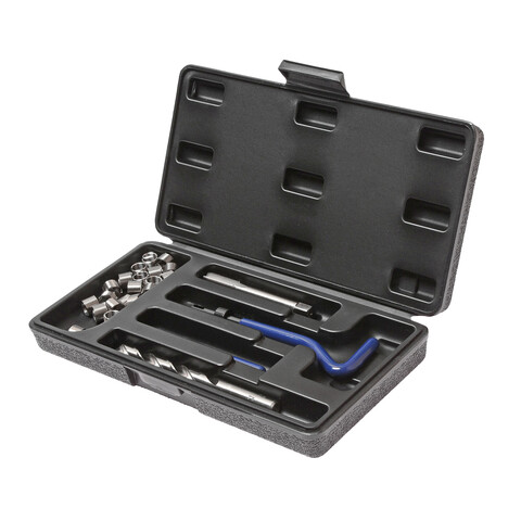 В комплект входят: сверло, метчик, установочный инструмент, инструмент для обламывания хвостовика, резьбовые вставки