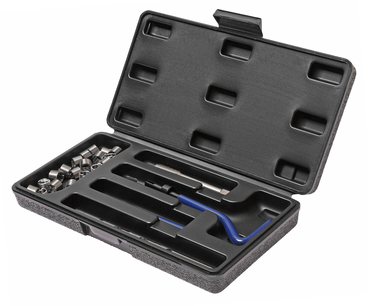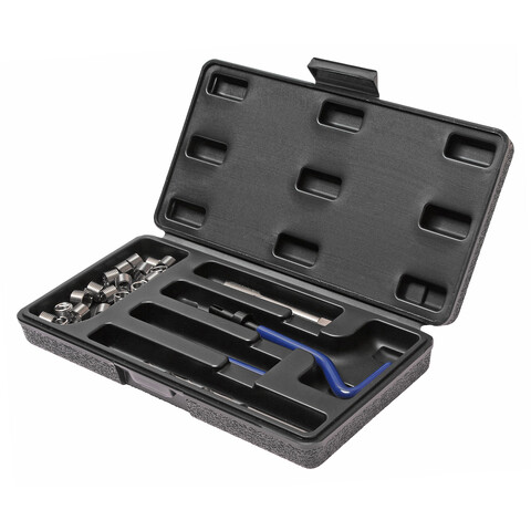 В комплект входят: сверло, метчик, установочный инструмент, инструмент для обламывания хвостовика, резьбовые вставки