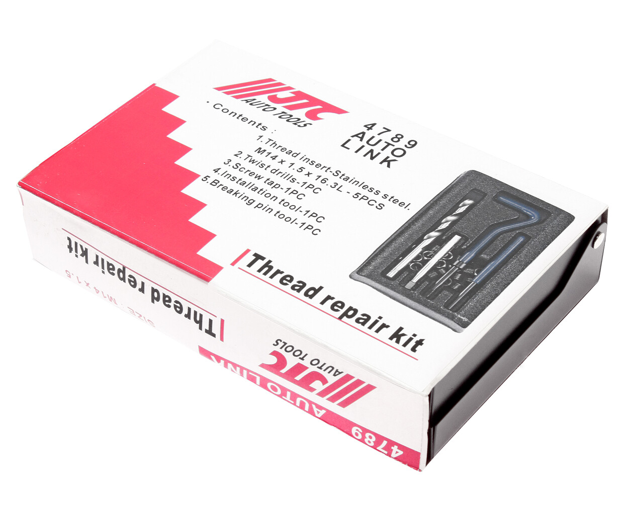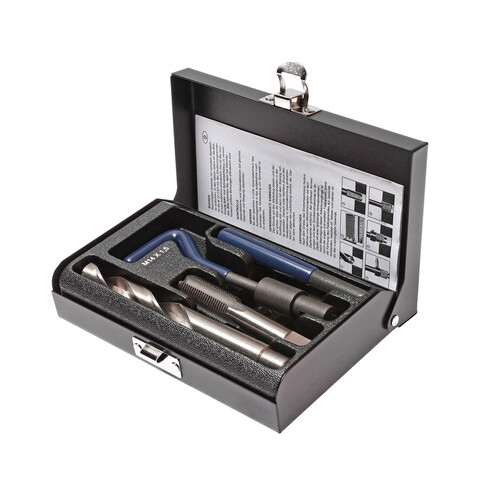 В комплект входят: сверло, метчик, установочный инструмент, инструмент для обламывания хвостовика, резьбовые вставки