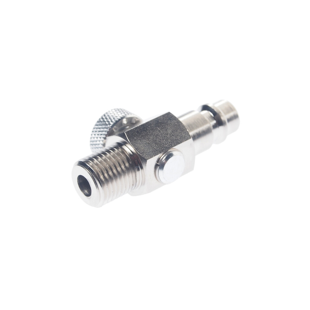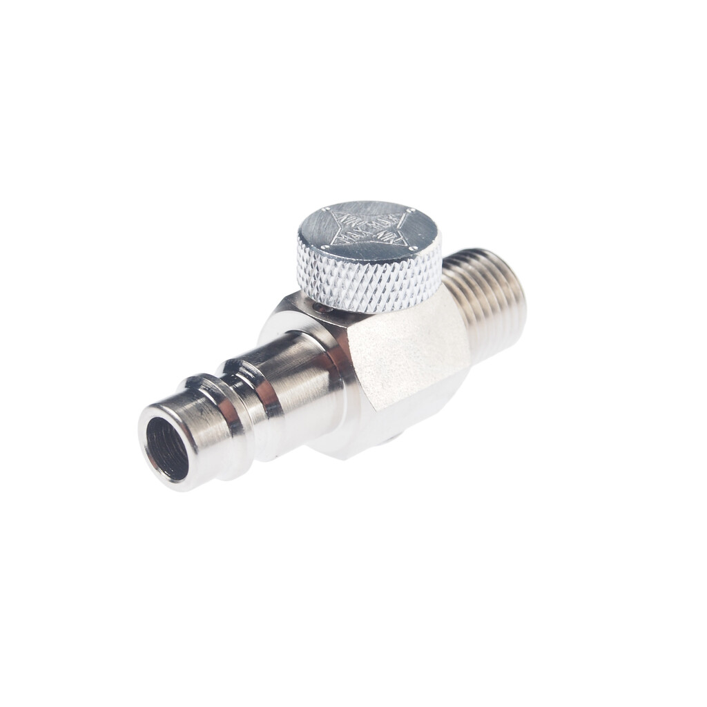 • Резьба с клеевым слоем. Вращение регулятора позволяет управлять мощностью воздушного потока. Материал: сталь, рабочее давление 15 кгс/см³. Тип штуцера: Европа.