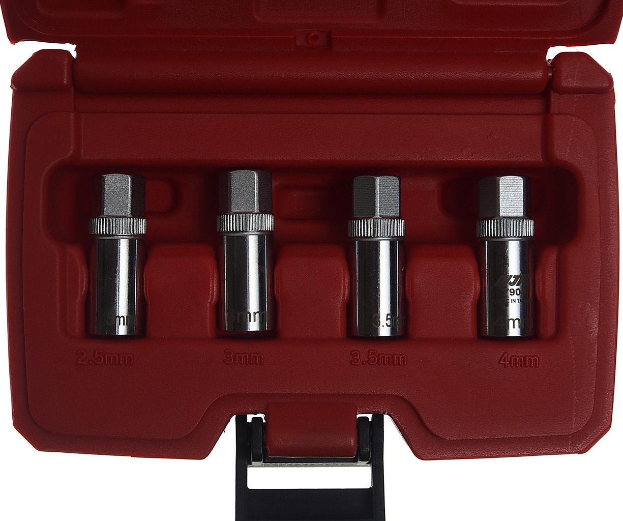• Предназначен для извлечения поврежд¸нных болтов без шляпок. Также служит для извлечения свечей накаливания. Комплектность: 1/4" Dr. x 2,5, 3, 3,5, 4 мм.