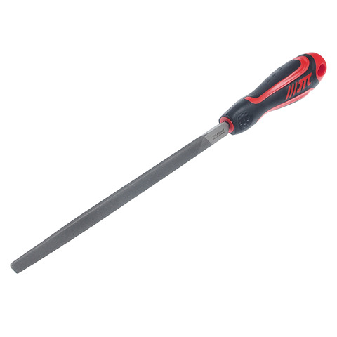 • Треугольный напильник JTC-K8054T с гладкими зубьями имеет длину в 200 мм и прорезиненную анатомическую рукоятку с отверстием для подвешивания инструмента.