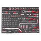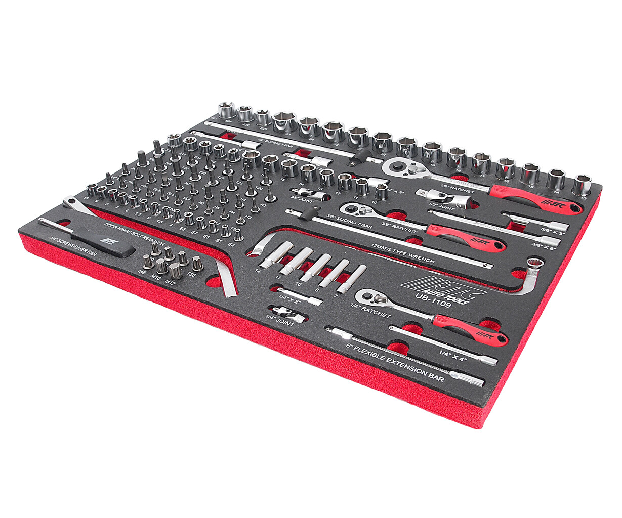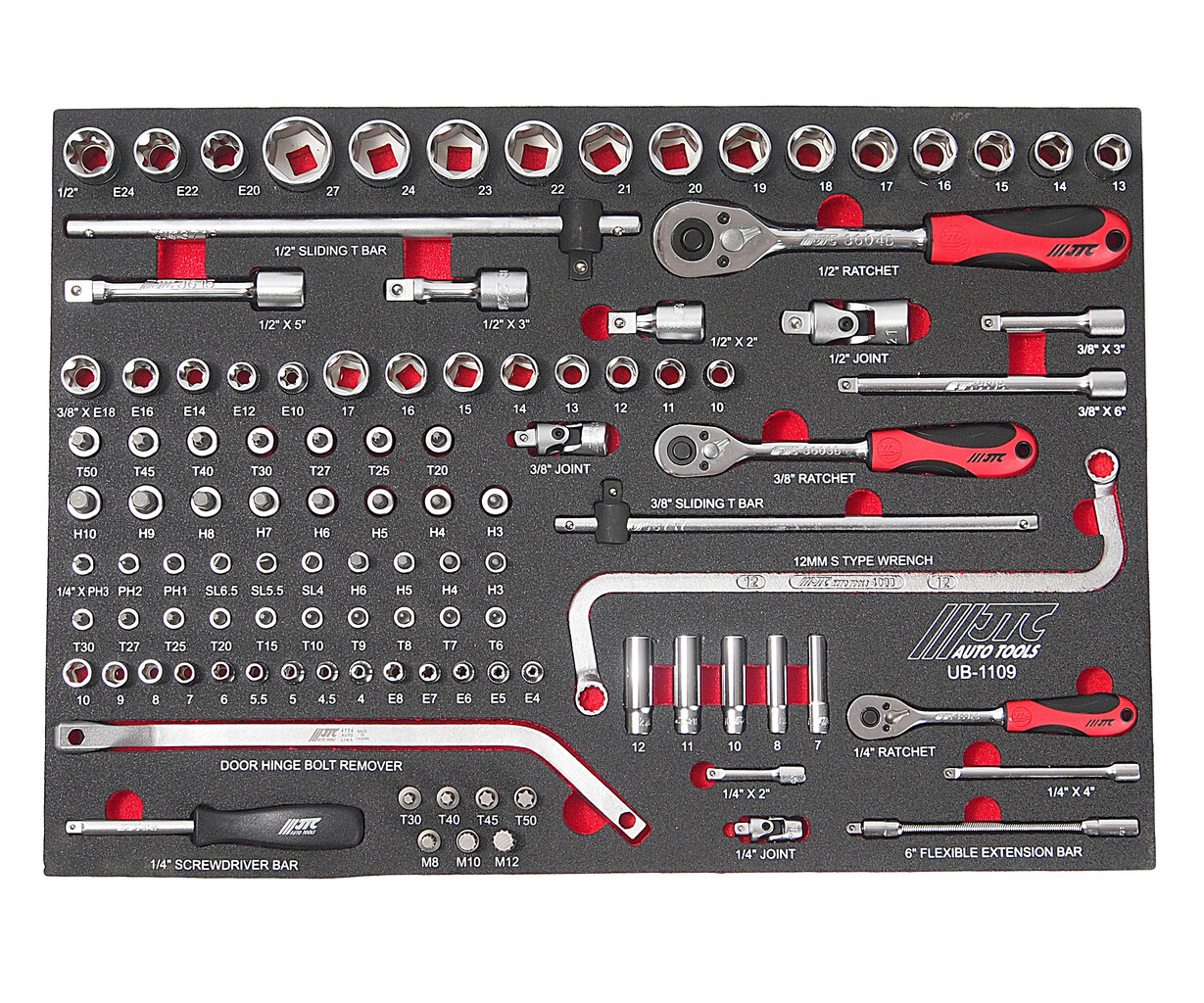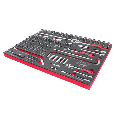 • В комплекте: Головки 1/2"Dr. х 6 граней: 13-24, 27 мм. Головки 1/2"Dr.Torx: Е20, Е22, Е24. Удлинители: 1/2"Dr: 2", 3", 5". Вороток с плавающей головкой 1/2"Dr: 12". Головки 3/8"Dr. х 6 граней: 10-17 мм. Головки 3/8"Dr.Torx: Е10-Е18. Удлинители: 3/8"Dr: 3", 6". Головки с насадкой Hex 3/8"Dr: H3-P10. Головки с насадкой Torx 3/8"Dr: T20-T50. Вороток с плавающей головкой 3/8"Dr: 10". Ключ S-образный: 12 мм. Головки 1/4"Dr. х 6 граней: 4-10 мм. Головки глубокие 1/4"Dr. х 6 граней: 7, 8, 10, 11, 12 мм. Головки 1/4"Dr.Torx: Е4, Е5, Е6, Е7, Е8. Головки с насадкой Torx 1/4"Dr: T6-T30. Головки с насадкой Hex 1/4"Dr: H3, H4, H5, H6. Головки с насадками 1/4"Dr: PH1-3, SL4-6.5. Комплект для снятия дверей: биты: M8, M10, M12, Т30, Т40, Т45, Т50; специальный изогнутый ключ 8 мм. Удлинитель 1/4"Dr. Удлинитель гибкий 1/4"Dr: 6". Трещотки: 1/4", 3/8", 1/2". Удлинители 1/2": 2", 4". Общее количество предметов: 109 шт.