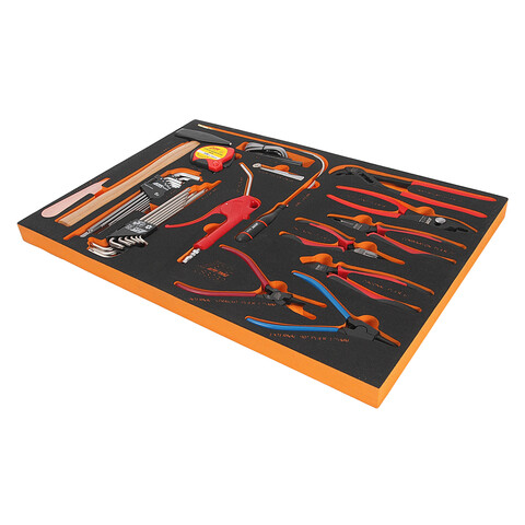 • В комплекте: Молоток 500 гр. Длинногубцы 6". Бокорезы 6". Пассатижи 7". Клещи переставные 8", 10". Индикатор напряжения. Набор прямых щупов (26 шт). Рулетка 5 м. Захват магнитный гибкий, 20". Продувочный пистолет. Съемники стопорных колец: HS, SB. Комплект шестигранников (с шаровидными наконечниками): 1.5-6, 8, 10 мм. Ключи Torx с отверстием: Т1OH-Т50H. Съемник панелей. Общее количество предметов: 32 шт.