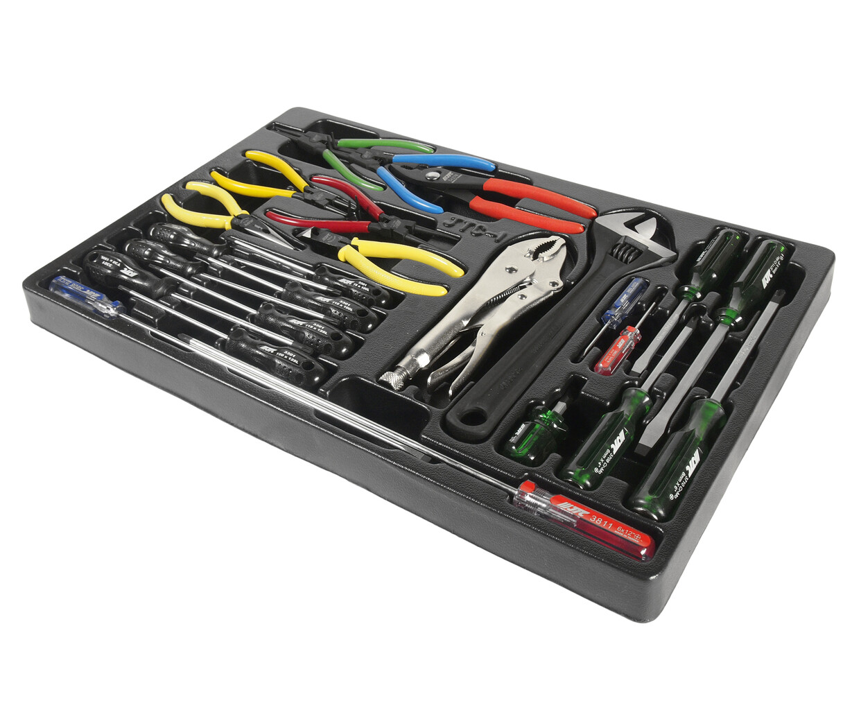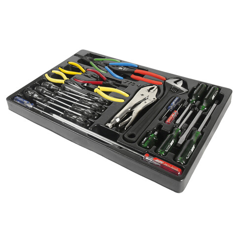 • В комплекте: 4 шт. - отвертки со сквозным стержнем: 4"(*), 4"(-), 6"(+), 6"(-). 1 шт. - отвертка укороченная 1-1/2". 4 шт. - отвертки с одноцветной рукояткой: 101 х Т(+), 101 х 2"(-), 1G2 х 12"(-), 107 х 12"(+). 7 шт. - отвертки TORX: Т8, Т10, Т15, Т20, Т25, Т27, Т30. 1 шт. - разводной ключ 12". 1 шт. - клещи с фиксатором 10". 1 шт. - длинногубцы 6". 1 шт. - бокорезы 6". 4 шт. - клещи со стопорной пружиной SS175, HS175, SB175, HB175.
