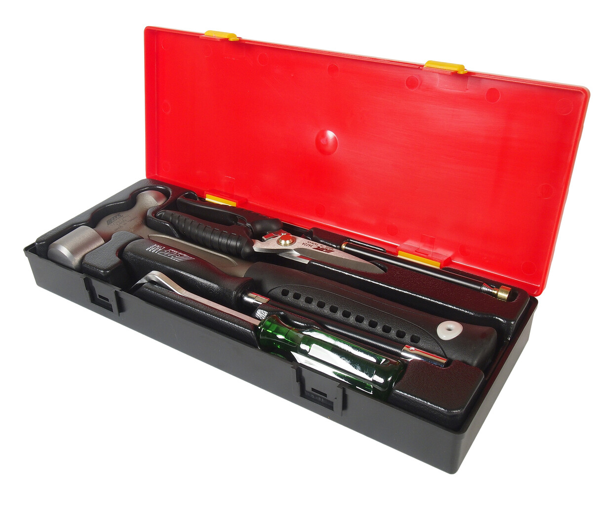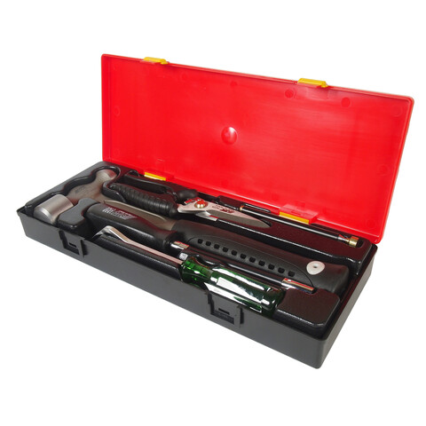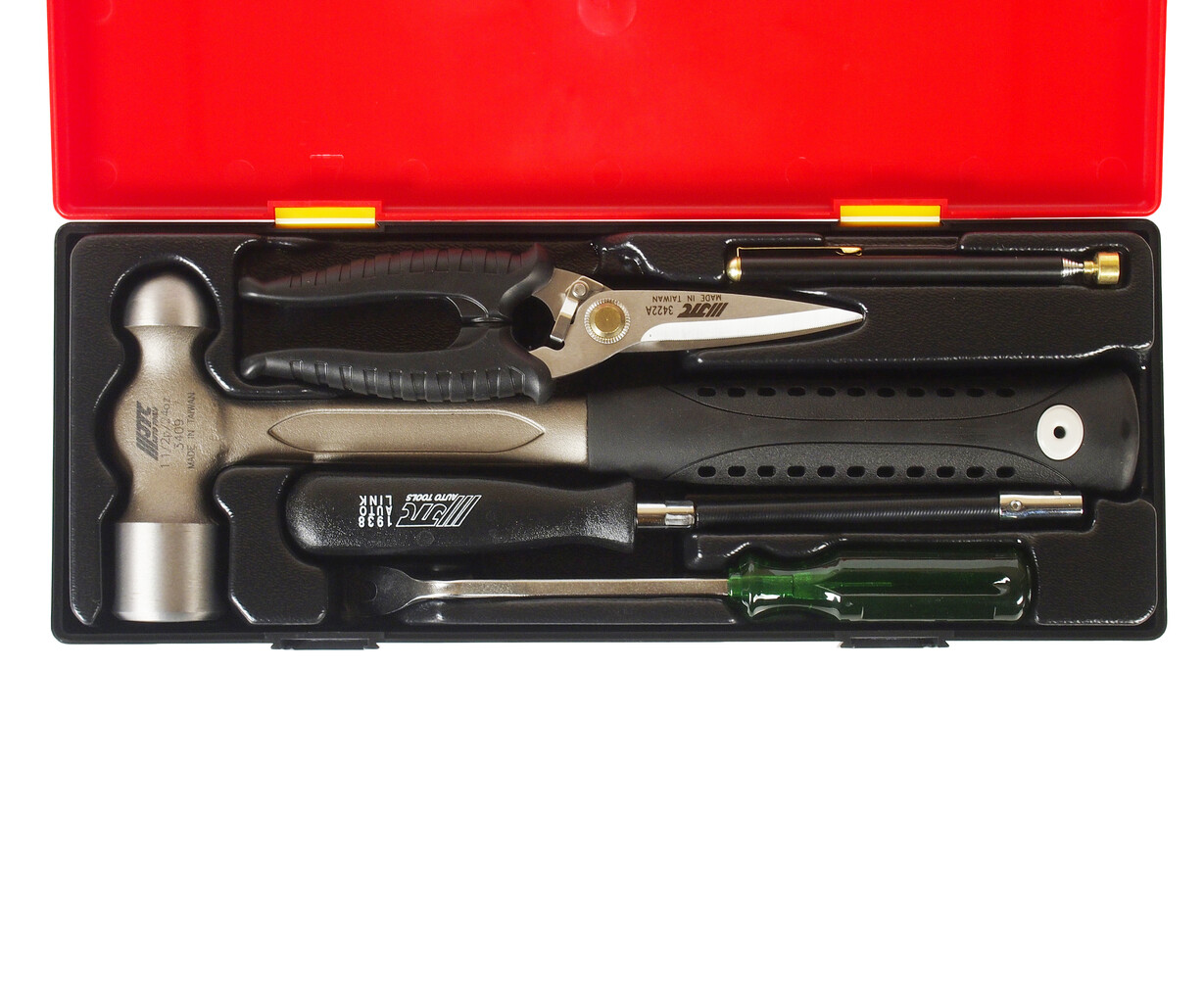 • В комплекте: JTC-3409: молоток металлический 1-1/2Р - 1 шт. JTC-3422А: ножницы 8" - 1 шт. JTC-3511: магнитный держатель 3.5LBS - 1 шт. JTC-19387: отвертка торцевая с гибким стержнем 7 мм. - 1 шт. JTC-2511: съемник для клипс - 1 шт. Общее количество предметов: 5 шт. Комплект упакован в прочный презентабельный бокс. Габаритные размеры: 375/140/60 мм. (Д/Ш/В) Вес: 1910 гр.