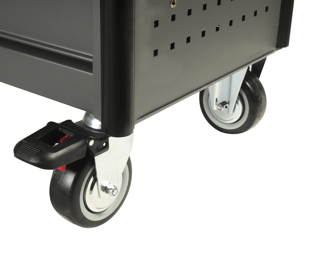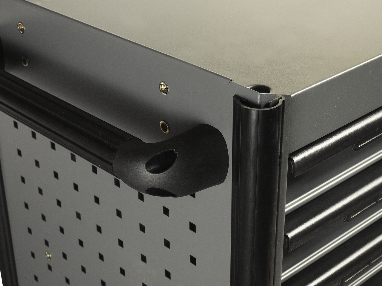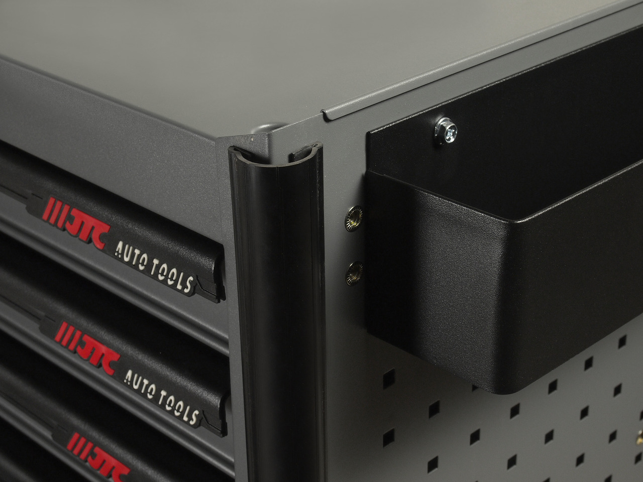Перфорированные боковые стенки с квадратными отверстиями предоставляют возможность разместить дополнительные аксессуары для хранения инструментов. Применяется с серией подвесных приспособлений JTC-3218.