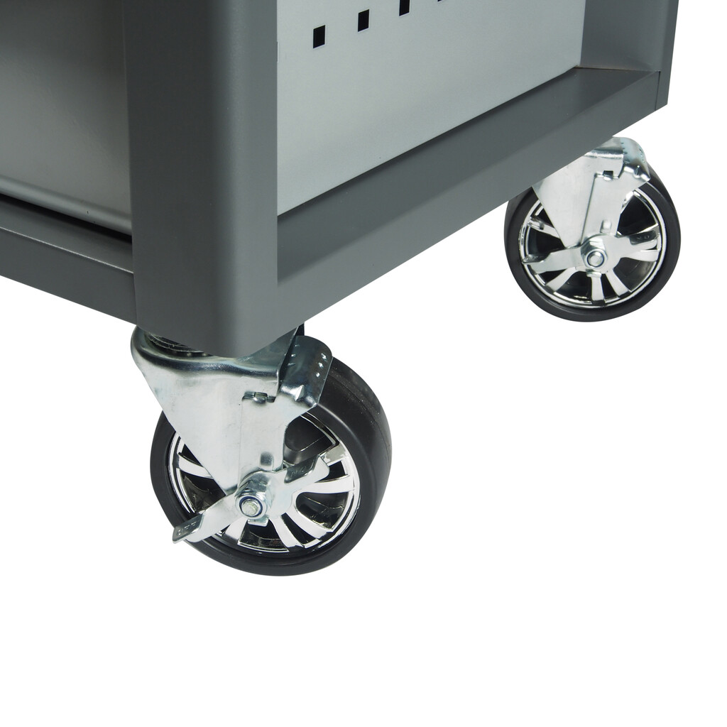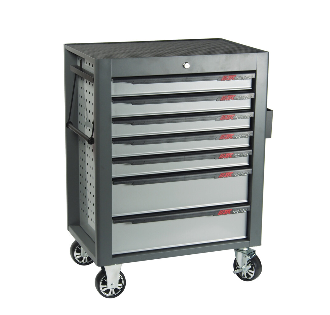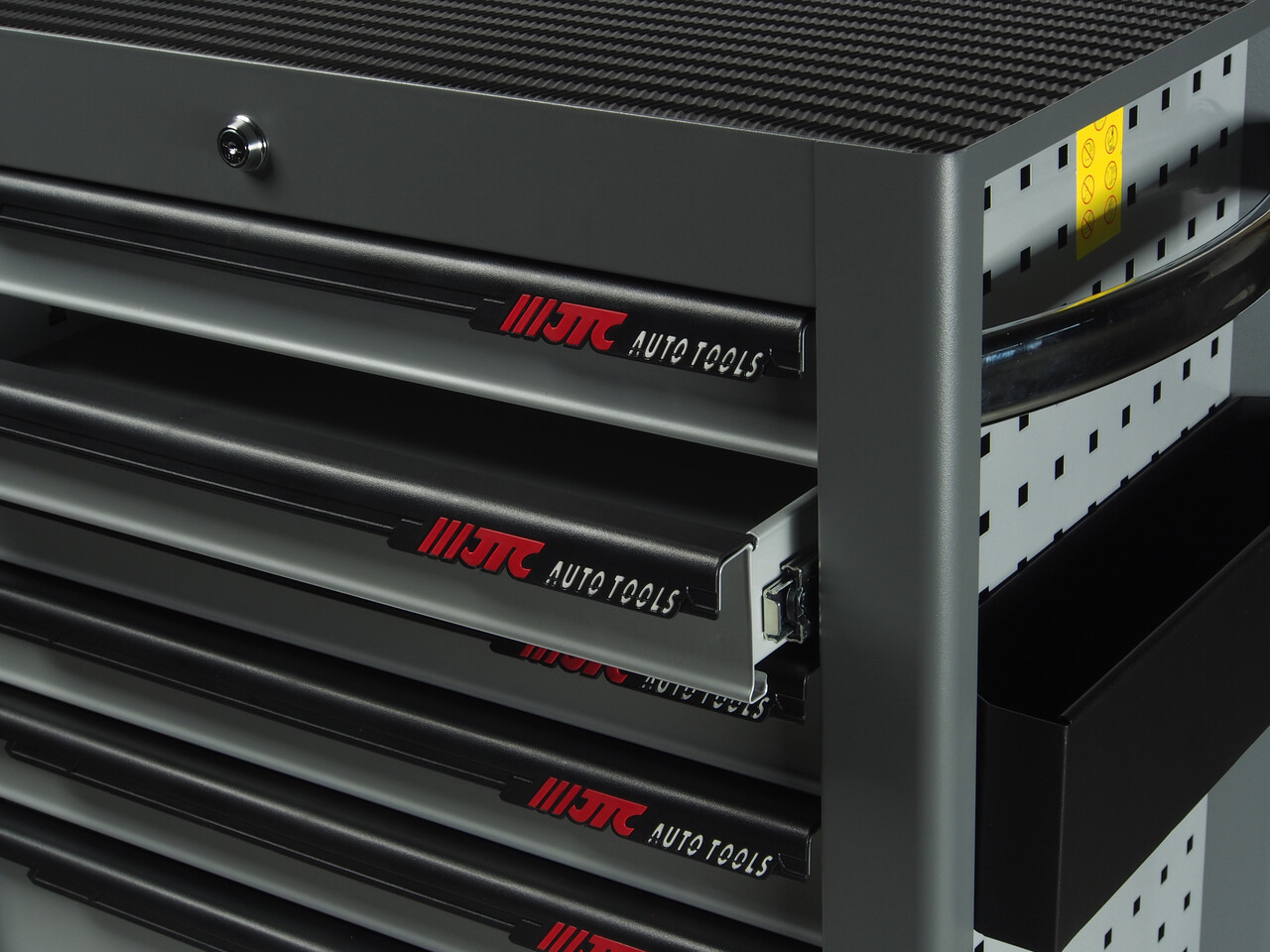 Перфорированные внутренние стенки боковых ящиков с квадратными отверстиями предоставляют возможность разместить дополнительные аксессуары для хранения инструментов. Применяется с серией подвесных приспособлений JTC-3218.