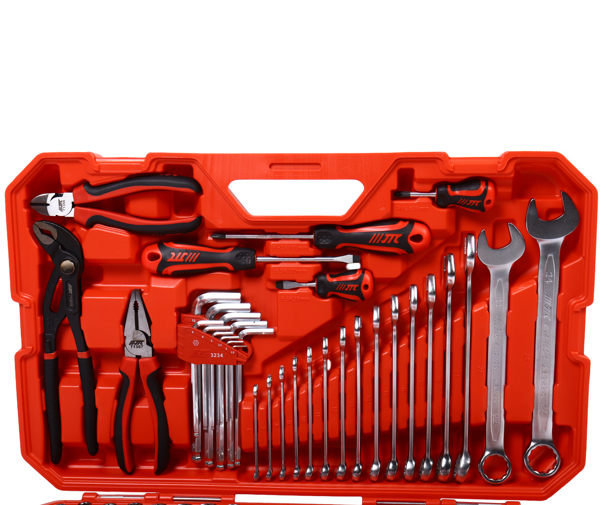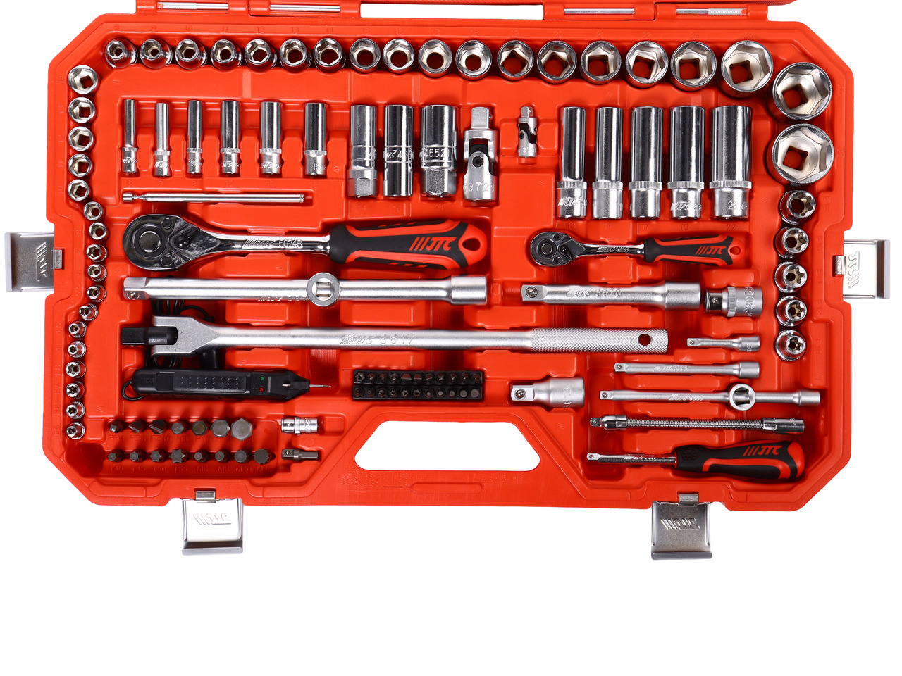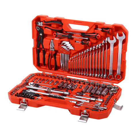 • 13 шт. Головки 1/4" 6-гран.: 4, 4.5, 5, 5.5, 6, 7, 8, 9, 10, 11, 12, 13, 14 мм. 6 шт. Головки 1/4" 6-гран. глубокие: 6, 7, 8, 10, 12, 13 мм. 19 шт. Головки 1/2" 6-гран.: 8, 9, 10, 11, 12, 13, 14, 15, 16, 17, 18, 19, 20, 21, 22, 24, 27, 30, 32 мм. 5 шт. Головки 1/2" 6-гран. глубокие: 13, 14, 17, 19, 22 мм. 4 шт. Головки 1/4" под звезду (E-Torx): E5, E6, E7, E8. 5 шт. Головки 1/2" под звезду (E-Torx): E10, E12, E14, E16, E18. 3 шт. Удлинитель 1/4": 2" (50 мм), 4" (100 мм), 6" (150 мм). 1 шт. Гибкий удлинитель 1/4" x 6" (150 мм). 1 шт. Карданный шарнир 1/4". 1 шт. вороток-отвертка 1/4" (150 мм). 1 шт. Трещотка 1/4" быстросъемная. 1 шт. Адаптер 3/8" (F) x 1/4" (M). 1 шт. Адаптер бит 1/4" x 1/4" SQ. 1 шт. Адаптер шестигр. хвост. 1/4" SQ. 3 шт. Удлинитель 1/2": 2" (50 мм), 5" (125 мм), 10" (250 мм). 3 шт. Свечные головки 1/2": 14, 16, 21 мм. 1 шт. Трещотка 1/2" быстросъемная. 1 шт. Карданный шарнир 1/2". 1 шт. Силовой вороток 1/2" (380 мм). 1 шт. Адаптер 3/8" (F) x 1/2" (M). 1 шт. Адаптер бит 1/2" x 5/16" SQ. 22 шт. Биты 1/4" x 25 мм: 5 шт.: H2.5, H3, H4, H5, H6. 7 шт. Torx Security: T10H, T15H, T20H, T25H, T27H, T30H, T40H. 4 шт.: PH0, PH1, PH2, PH3. 3 шт.: SL4, SL5.5, SL7. 2 шт.: PZ1, PZ2. 1 шт. Квадратная (Robertson): S0. 15 шт. Биты 5/16" x 30 мм: 4 шт.: H8, H10, H12, H14. 4 шт. Torx: T40, T45, T50, T55. 4 шт. Spline: M6, M8, M10, M12. 2 шт.: SL8, SL10. 1 шт.: PH4. 11 шт. Г-образный ключ HEX: 1.5, 2, 2.5, 3, 4, 5, 6, 7, 8, 9, 10 мм. 16 шт. ключ рожково-накидной: 6, 7, 8, 9, 10, 11, 12, 13, 14, 15, 16, 17, 19, 21, 22, 24 мм. 1 шт. Комбинированные пассатижи 7" (175 мм). 1 шт. Бокорезы 6" (150 мм). 1 шт. трубный ключ 10" (250 мм). 1 шт. Автомобильный пробник-индикатор. 1 шт. Гибкий магнитный съемник 1.5 фунта (0.7 кг). 4 шт. Отвертки: 2 шт. Крестовые: PH2 x 38, PH2 x 100 мм. 2 шт. Шлицевые: SL6.5 x 38, SL6.5 x 100 мм.