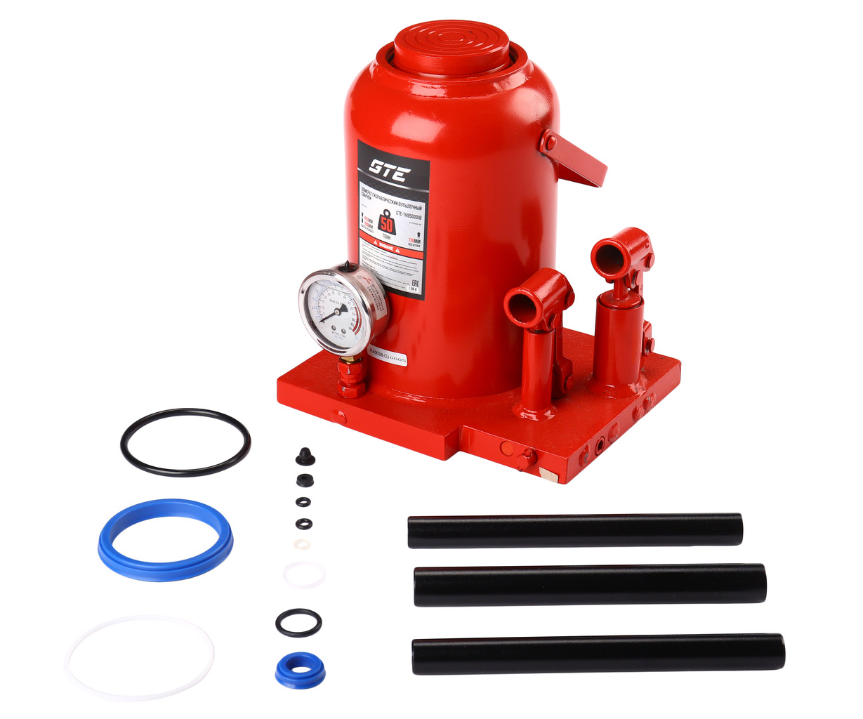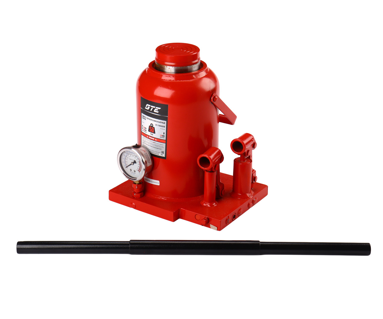 Гидравлический бутылочный домкрат GTE-TH950001B — высококачественное силовое оборудование для выполнения подъемных работ при диагностике и ремонте автомобиля в автосервисах, шиномонтажах и автотранспортных предприятиях. Гидравлический домкрат с ручным приводом способен поднимать различные виды грузов и транспортных средств до 50 тонн, обеспечивая надежную и безопасную процедуру подъема.