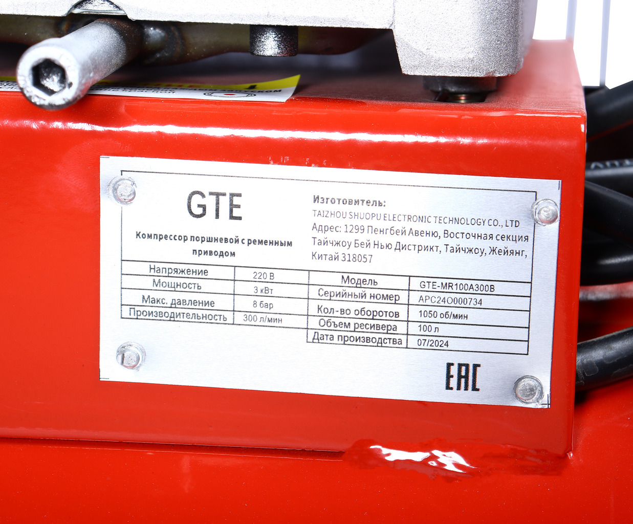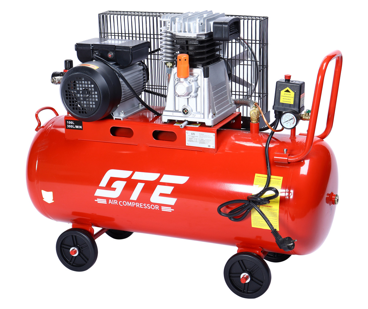 Компрессор пневматический 220В 3.0кВт 8атм. 300л/мин. ресивер-100л поршн. ремен. одноступенчатый GTE