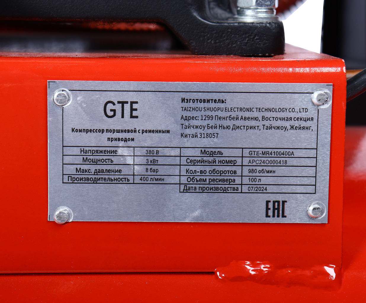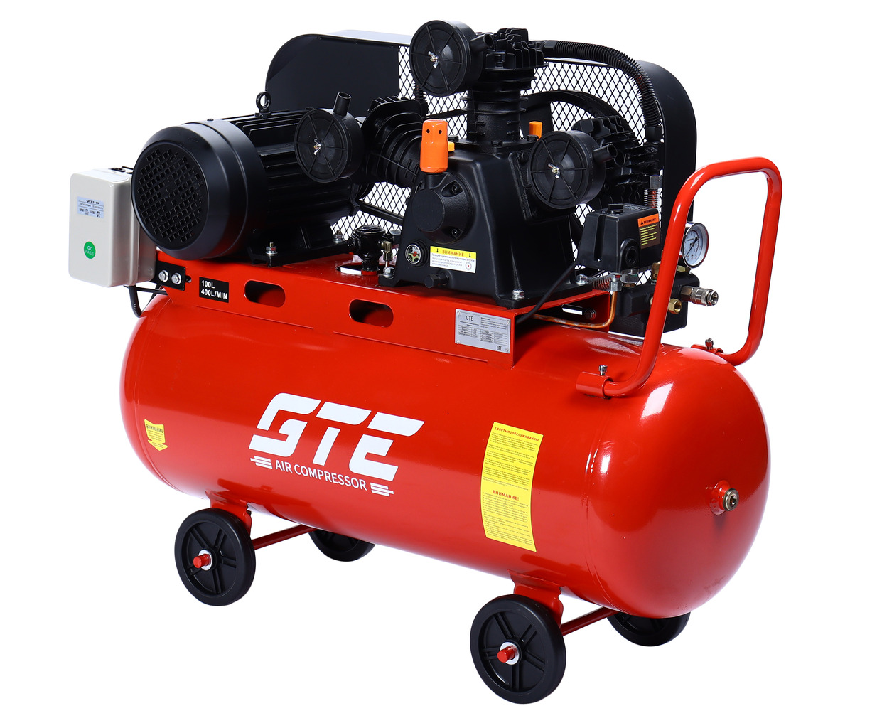 Компрессор пневматический 380В 3.0кВт 8атм. 400л/мин. ресивер-100л поршневой ременной GTE