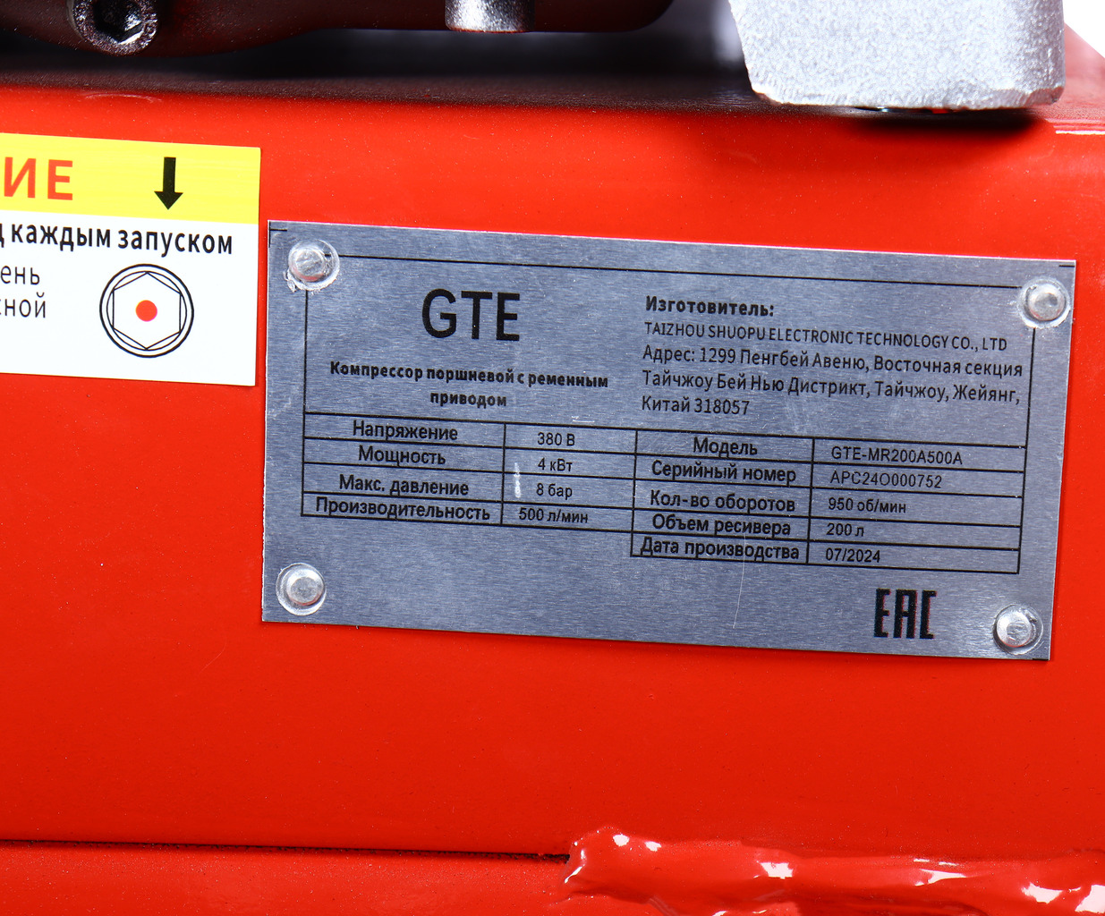 Компрессор пневматический 380В 4.0кВт 8атм. 500л/мин. ресивер-200л поршн. ремен. одноступенчатый GTE