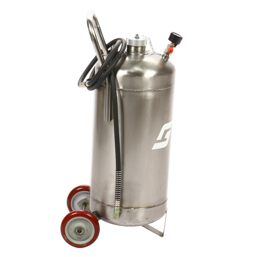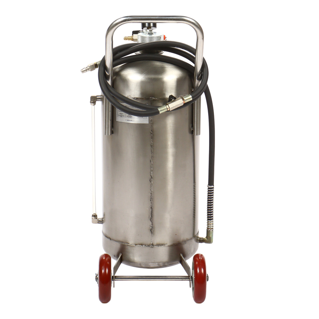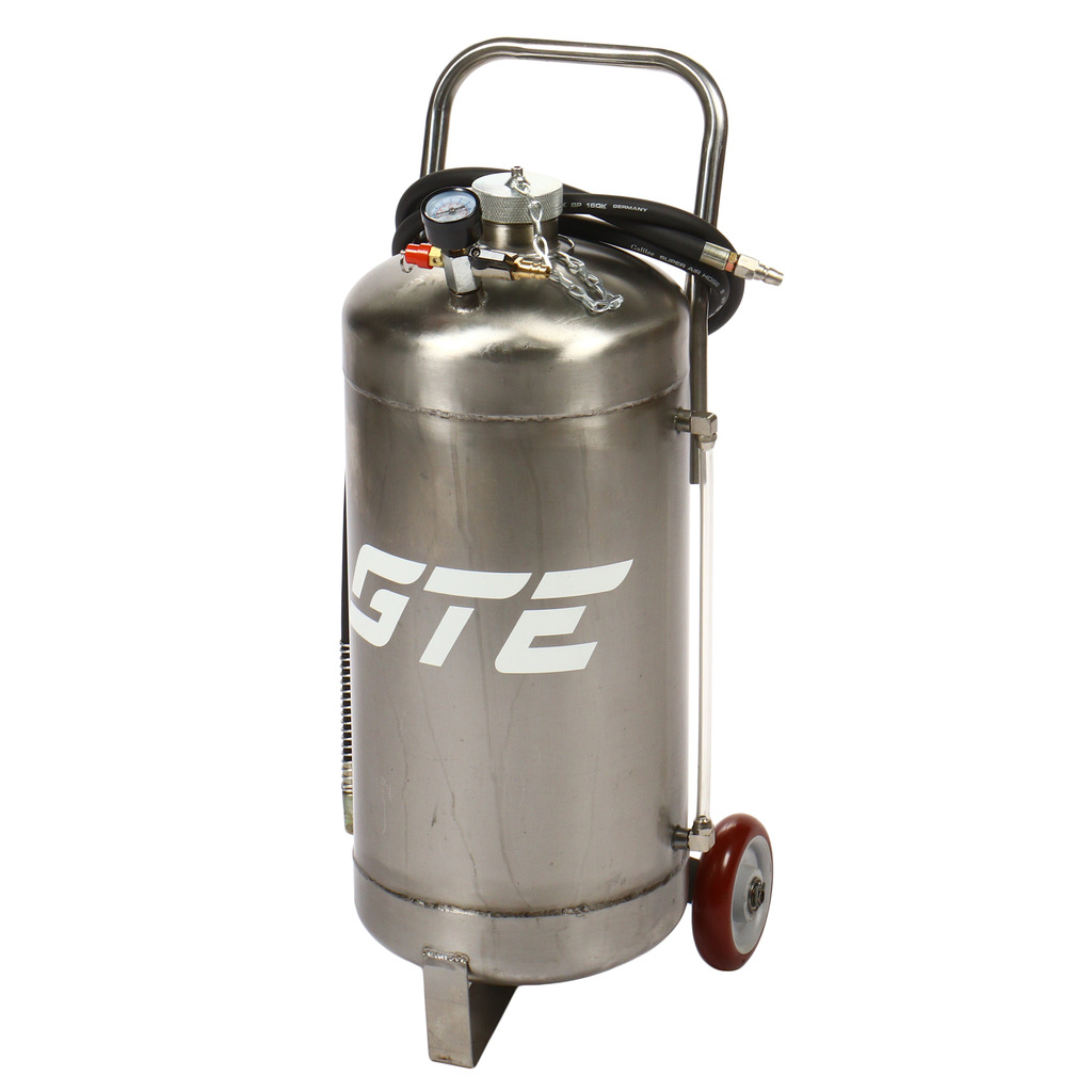 Пневматическая установка для подачи масла GTE-T14104 представляет собой стальную емкость объемом 24 л, c ручкой для удобства перемещения в помещении автосервиса, оборудована пневматическим насосом, блягодаря которому создается давление, необходимое для подачи масла и сходных материалов.