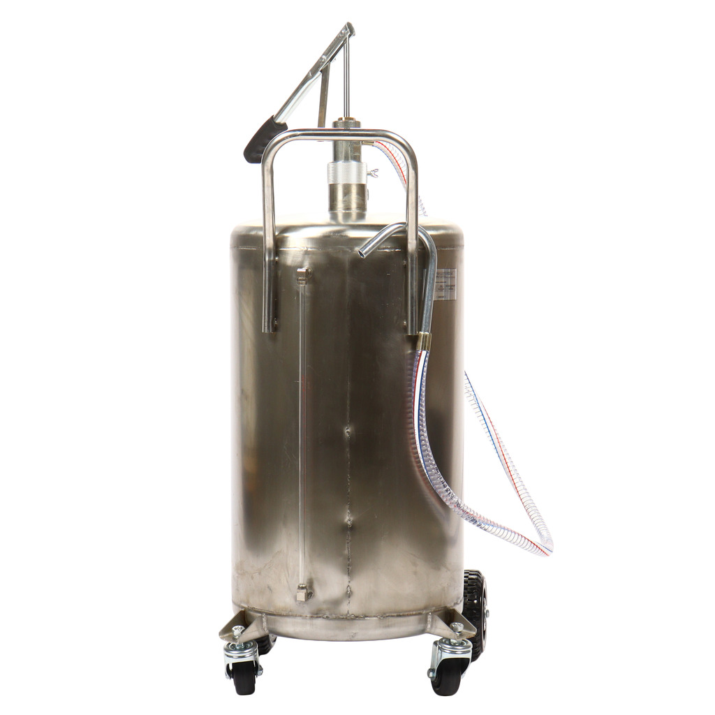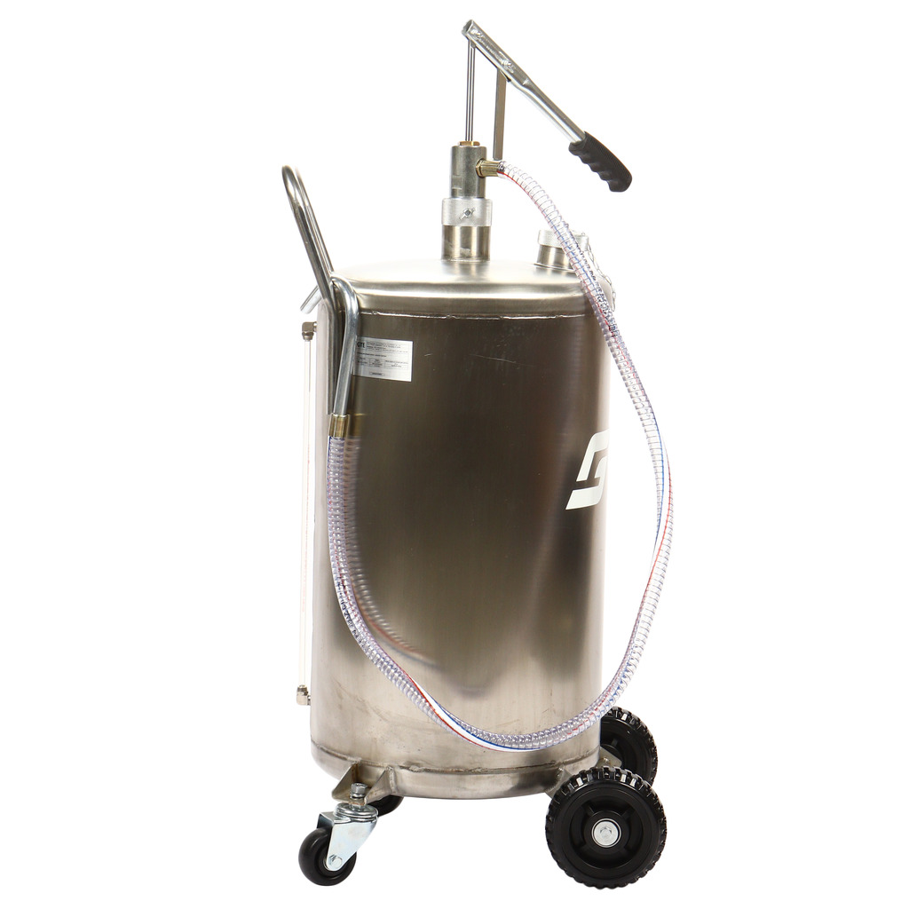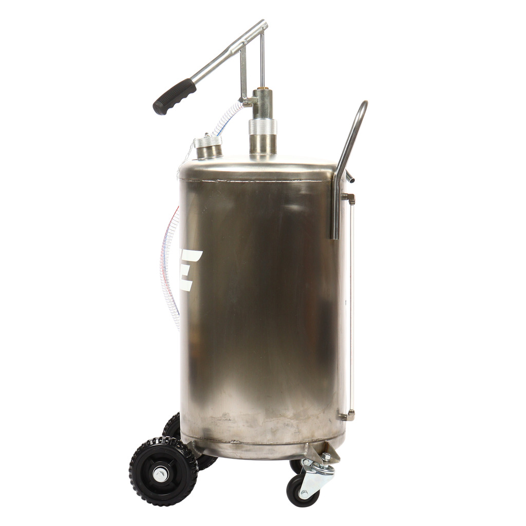 Установка для подачи масла GTE-T14151 с ручным приводом представляет собой стальную емкость объемом 70 л, c ручкой для удобства перемещения в помещении автосервиса, оборудована ручным насосом, который создает давление, необходимое для подачи масла и сходных материалов.