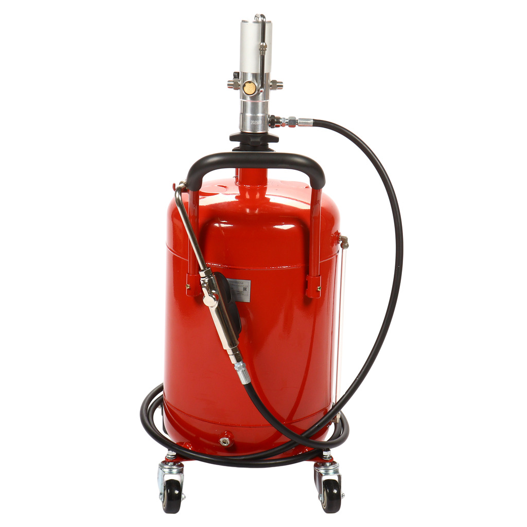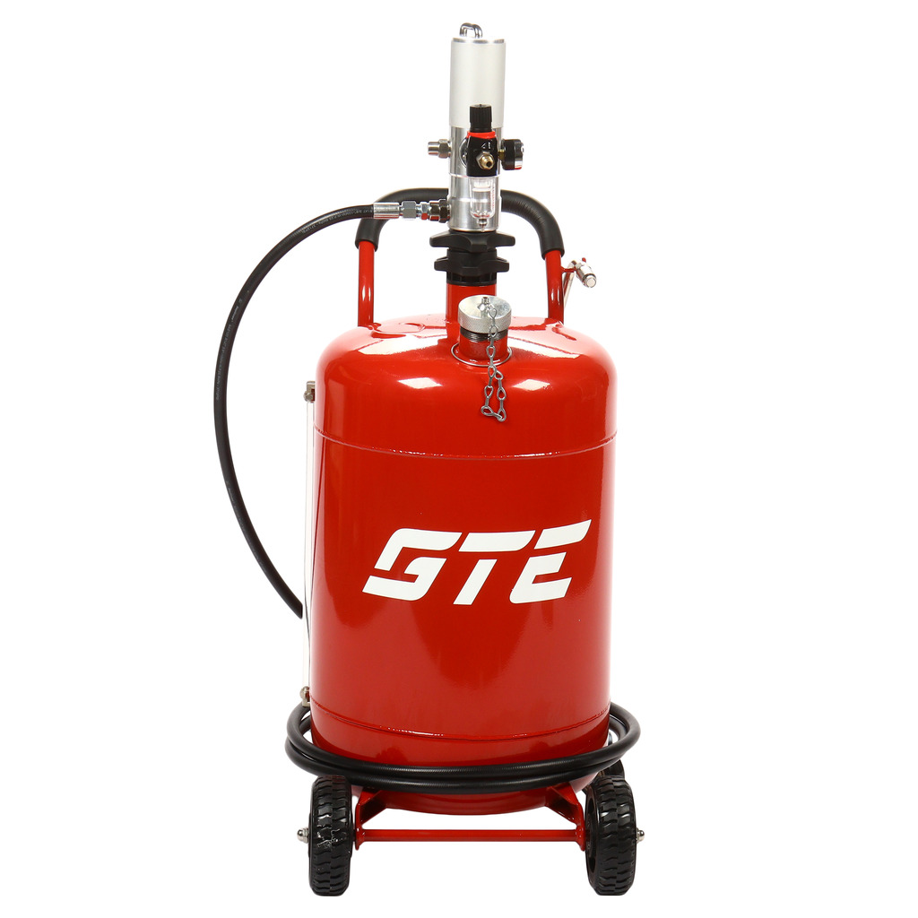 Пневматическая установка для подачи масла GTE-T14105 представляет собой стальную емкость объемом 70 л, c ручкой для удобства перемещения в помещении автосервиса, оборудована пневматическим насосом, блягодаря которому создается давление, необходимое для подачи масла и сходных материалов.