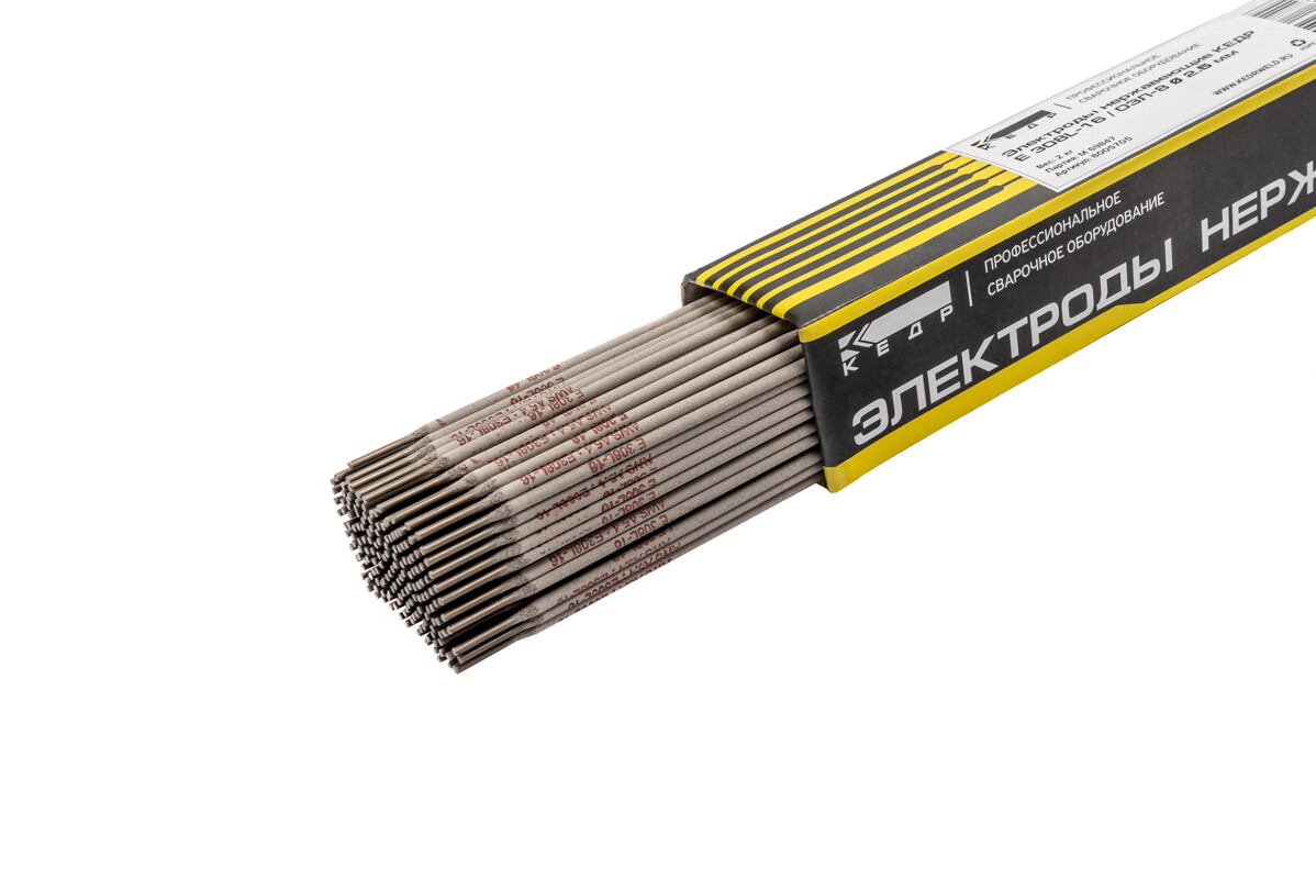 Электроды E 308L-16 / ОЗЛ-8 Ø 2,5 мм КЕДP пачка 2 кг (цена указана за 1 кг.) - электроды c пониженным содержанием углерода для сварки высоколегированных коррозионностойких сталей во всех пространственных положениях, кроме вертикального сверху вниз. Отличаются высокой стабильностью и эластичностью дуги, а также гарантированным лёгким поджигом.