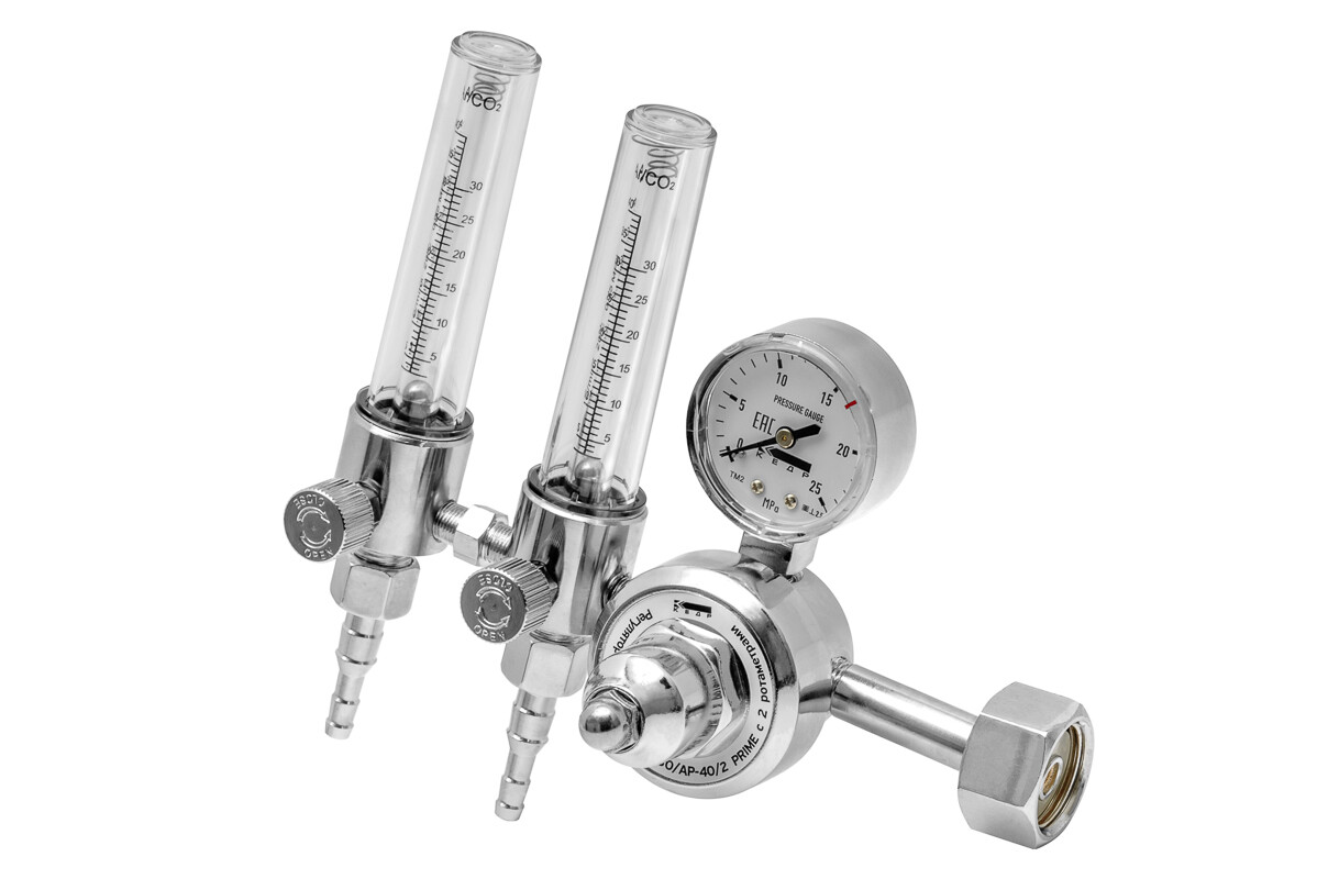 Регулятор расхода КЕДР У-30/АР-40/2 PRIME с 2 ротаметрами предназначен для понижения давления защитного газа, подаваемого из магистрали или баллона, и поддержания постоянного заданного расхода при питании постов сварочного оборудования для MIG/MAG и TIG-сварки.