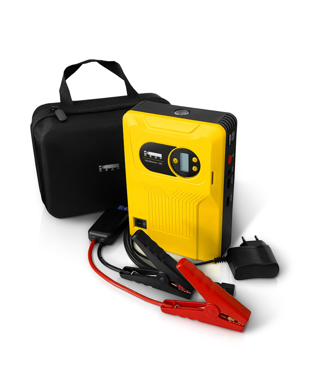 КЕДР UltraSTARTER-140 - многофункциональное пуско-зарядное устройство (ПЗУ) предназначено для экстренного запуска двигателя автомобиля в случае недостаточного заряда аккумулятора, а также выполняет функцию зарядного устройства для широкого спектра портативной электроники (планшеты, смартфоны, беспроводные наушники и др.), включая встроенный компрессор для накачки шин автомобилей и прочей колесной техники.