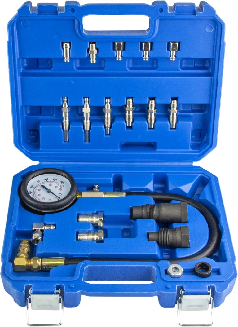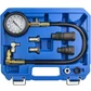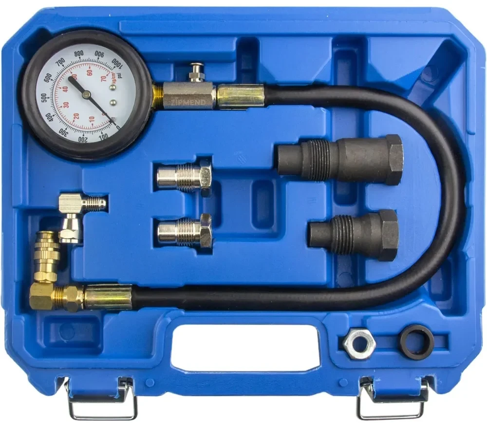 - Оснащен манометром 0-70bar (0—1000 psi) с клапаном для сброса давления, гибкий шланг с быстросъемным штуцером, адаптеры для свечей накаливания и прочие переходники.
