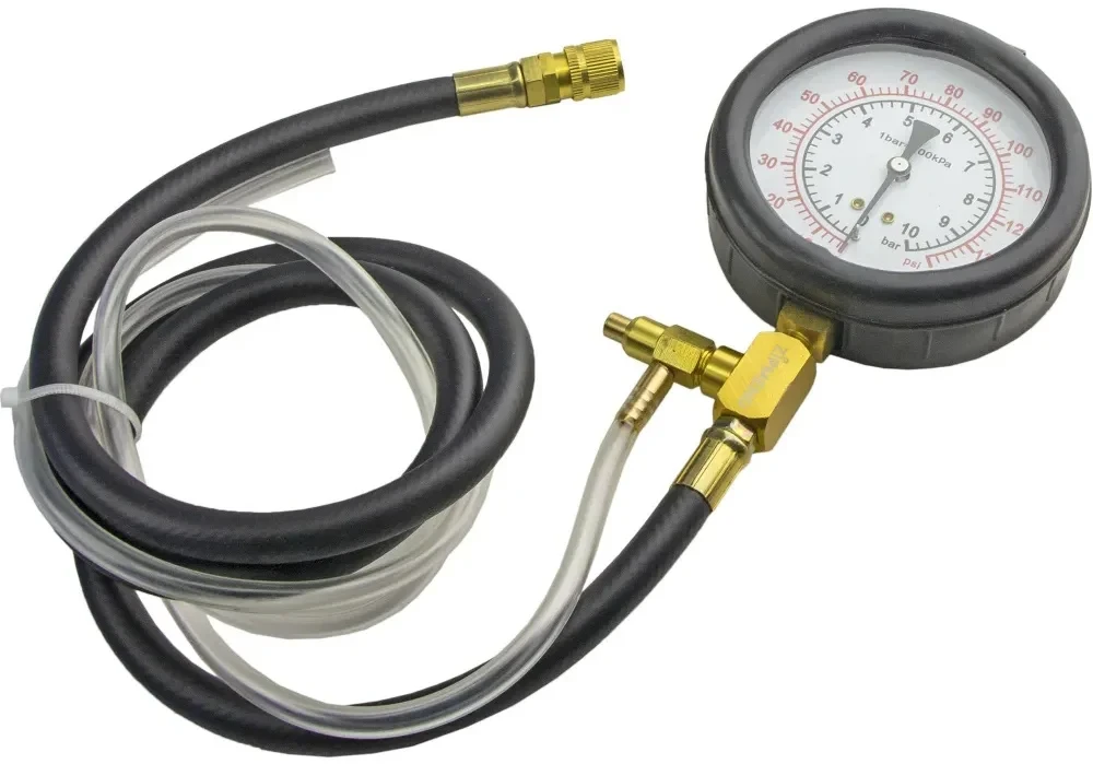 - Состоит из манометра с клапаном сброса давления диапазон измерений (в системах Бар и PSI: 0-10 Бар, 0-140 PSI), который обеспечивает высокую точность показаний, переходников для подключения к топливной системе различных марок автомобилей и соединительных шлангов из бензостойкой резины.