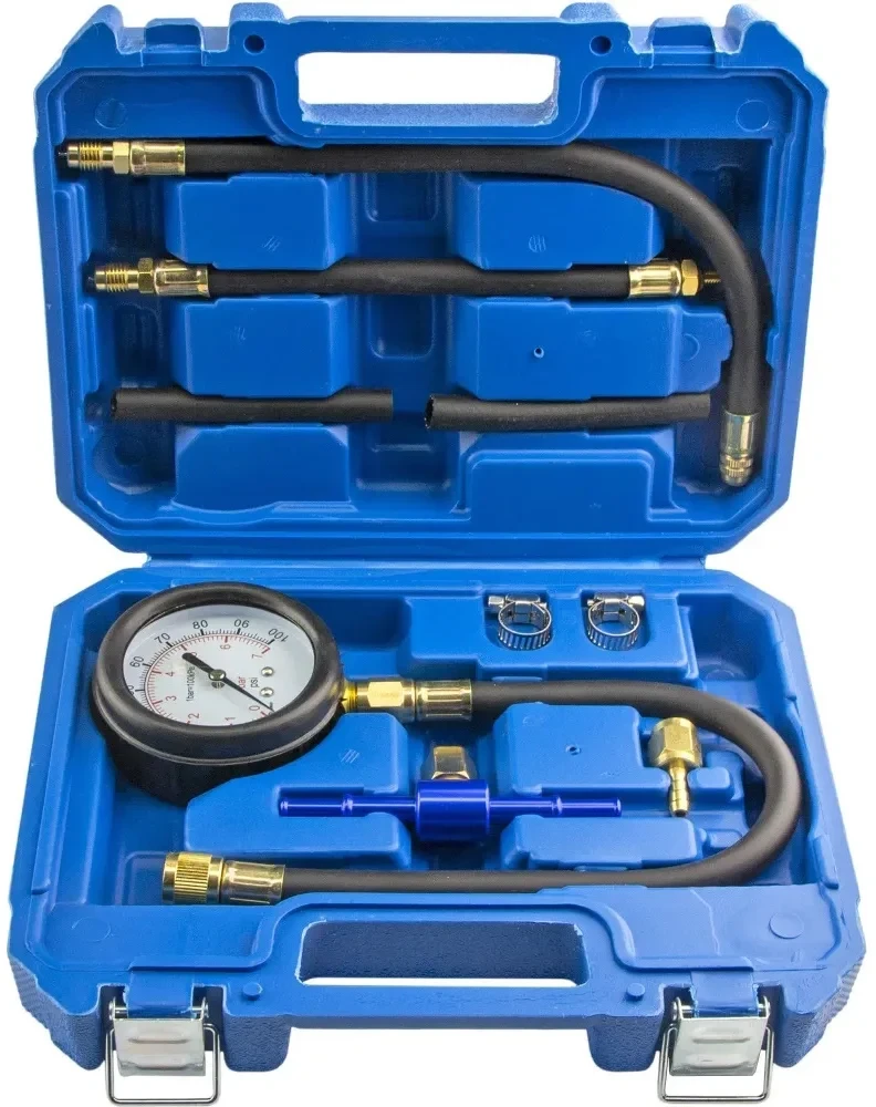 - В комплект поставки входит манометр (в системах Bar и Psi: 0-7 Bar, 0-100 Psi) в защитном резиновом кожухе c гибким шлангом 350 мм., шланги гибкие резьбовые 200 и 300 мм., два гибких отрезка шланга внутренний Ø5 и 8 мм., длиной 90 мм., алюминиевого фитинга (тройник), фитинг переходик и 2 хомутов для подсоединения тестера к двигателю авто.