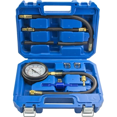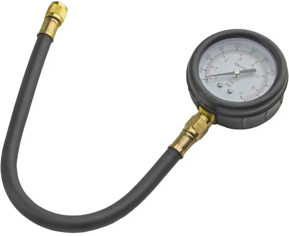 - Состоит из манометра с диапазоном измерений (в системах Bar и PSI: 0-7 Bar, 0-100 PSI), который обеспечивает высокую точность показаний, и адаптера с различными насадками для подключения к разным типам двигателей.