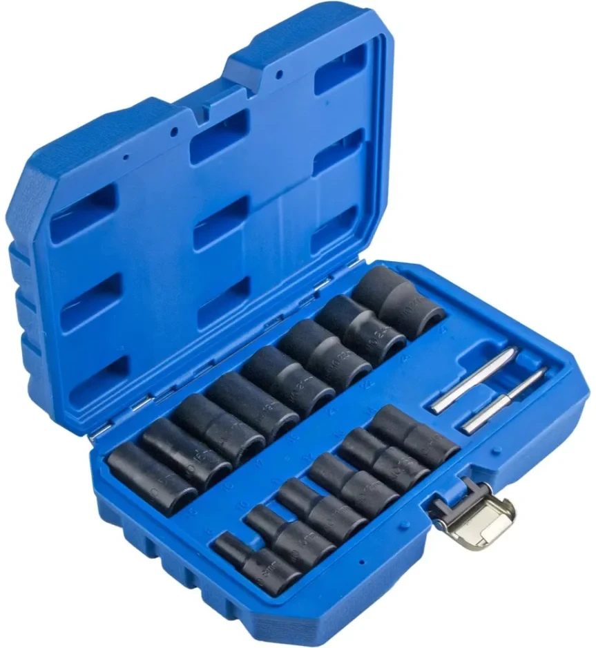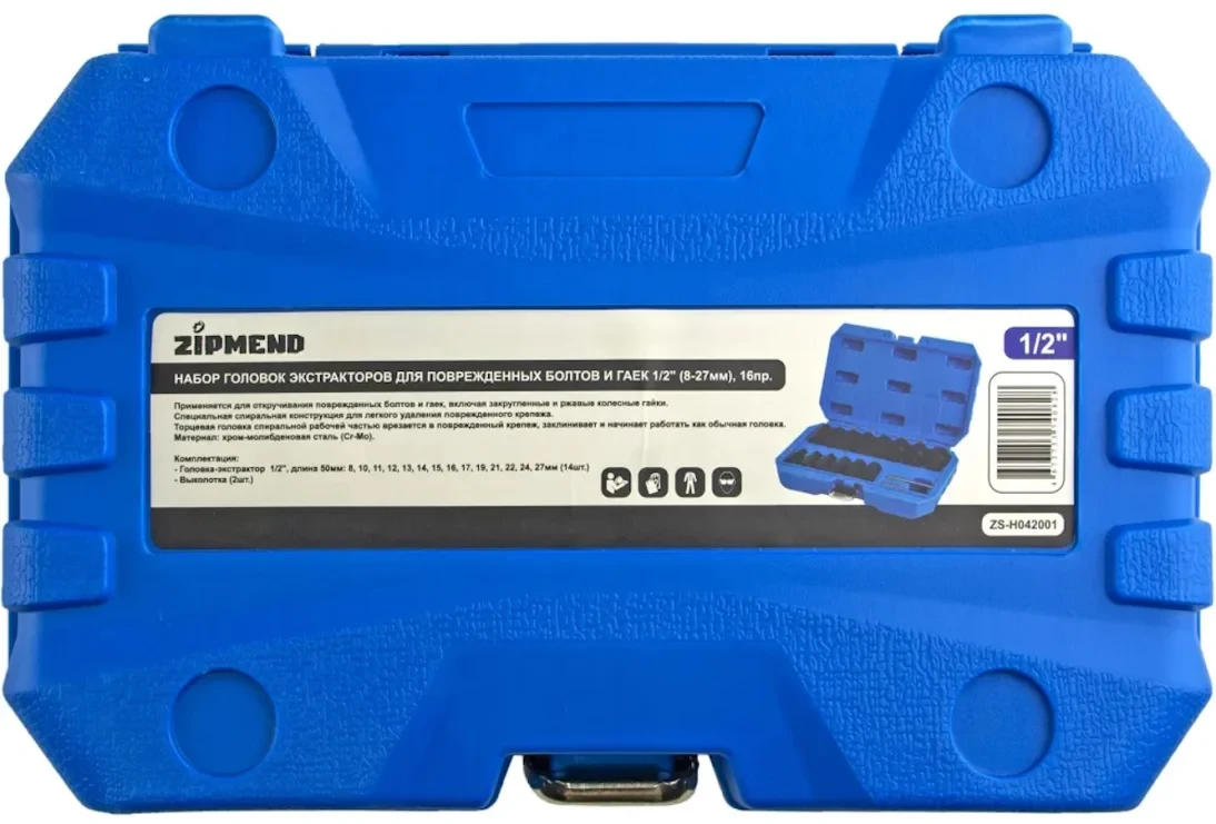 - Набор головок ZS-H042001 для поврежденных болтов и гаек, 1/2" 16 предметов (8-27мм.), в кейсе удаляет поврежденные гайки, шпильки или болты, включая закругленные и ржавые колесные гайки.