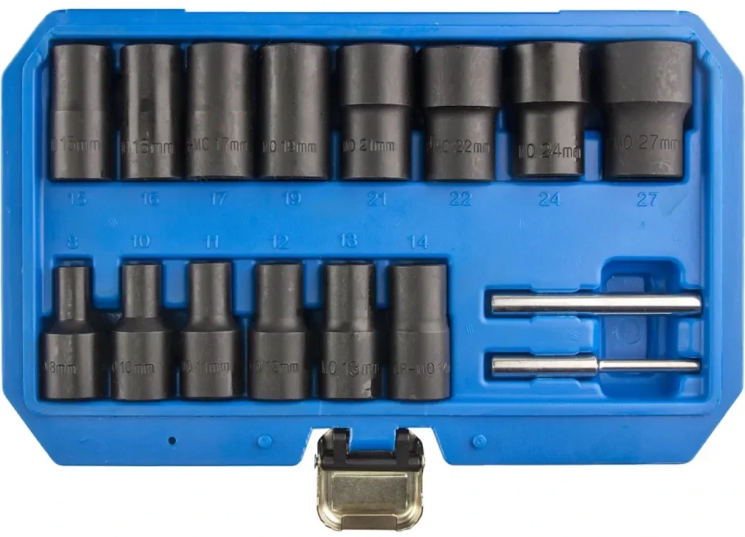 - Головка-экстрактор 1/2", длина 50 мм: 8, 10, 11, 12, 13, 14, 15, 16, 17, 19, 21, 22, 24, 27 мм - 14 шт.