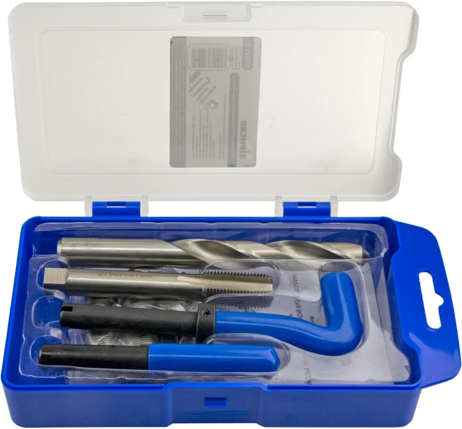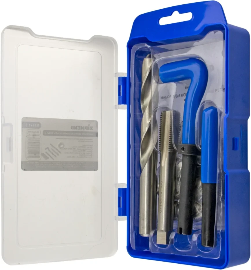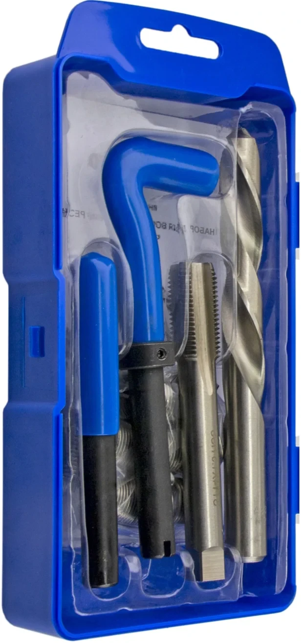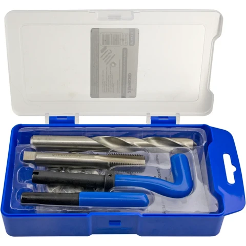 - Применение данного набора обеспечивает быстрое восстановление поврежденной резьбы при помощи специальных приспособлений.