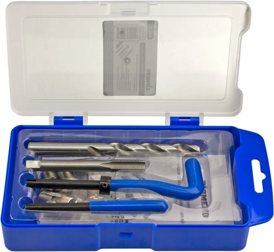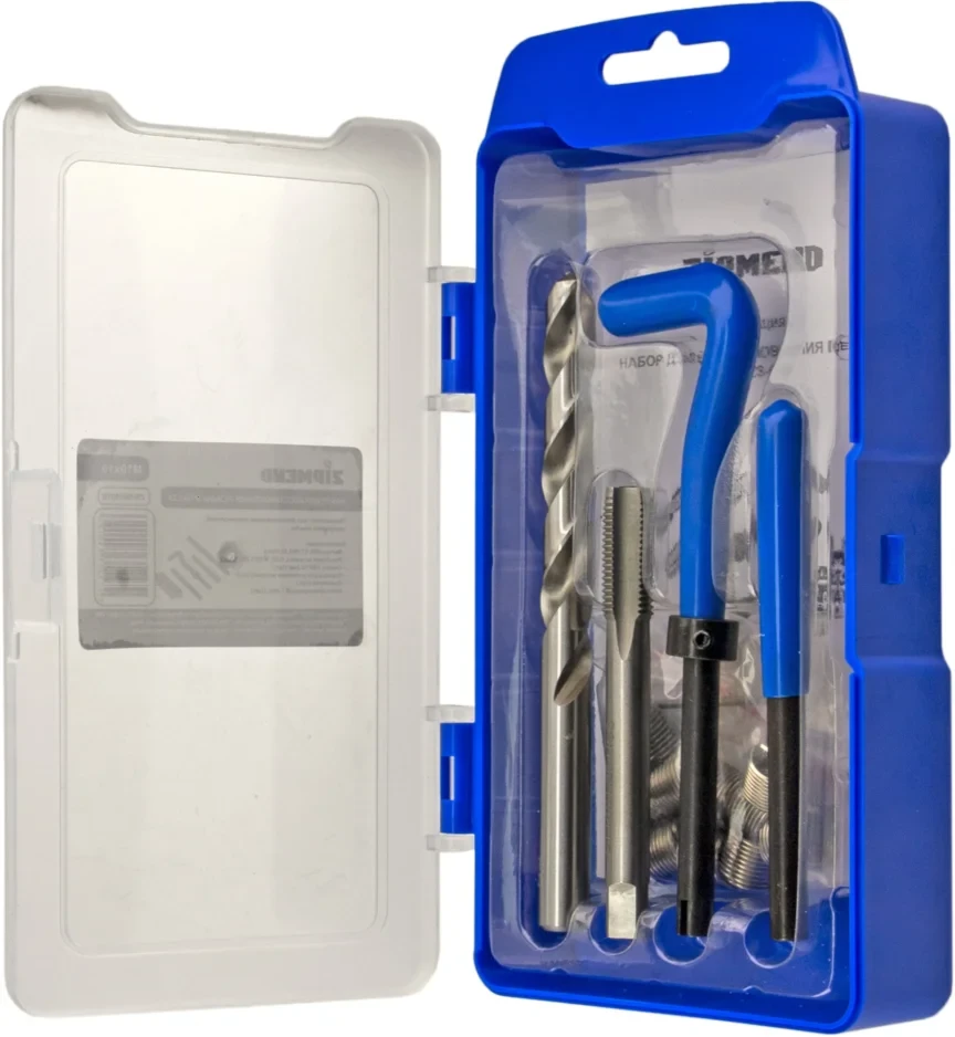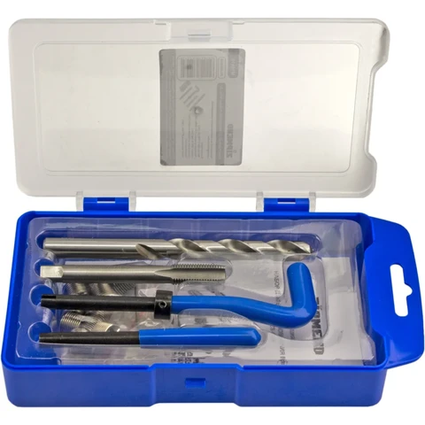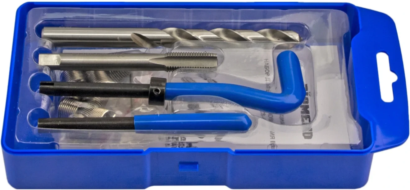 - Применение данного набора обеспечивает быстрое восстановление поврежденной резьбы при помощи специальных приспособлений.