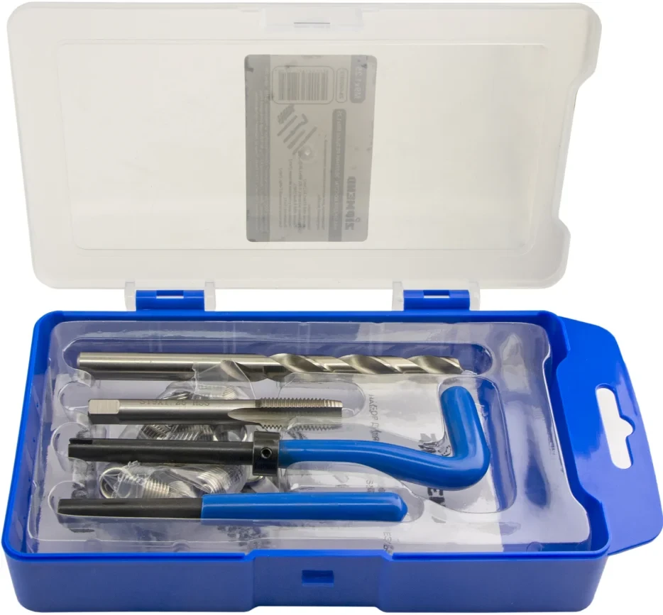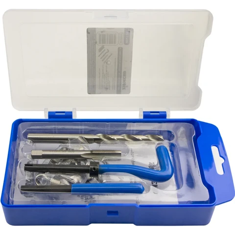 - Применение данного набора обеспечивает быстрое восстановление поврежденной резьбы при помощи специальных приспособлений.
