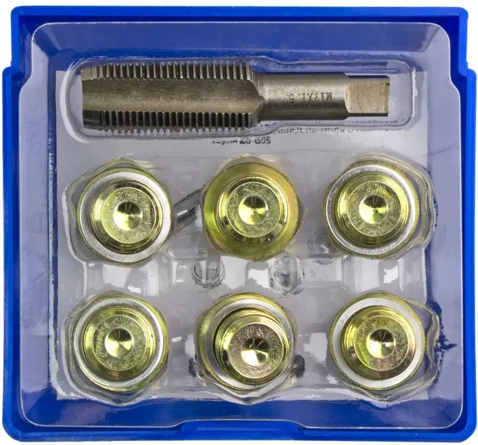 - Применение данного набора обеспечивает быстрое восстановление поврежденной резьбы при помощи специальных приспособлений.