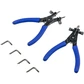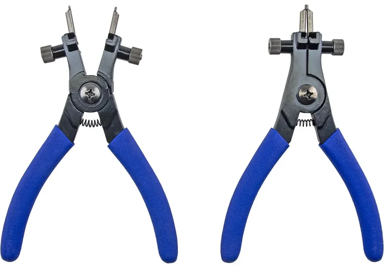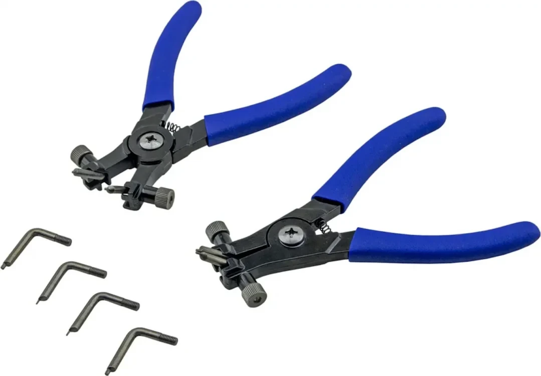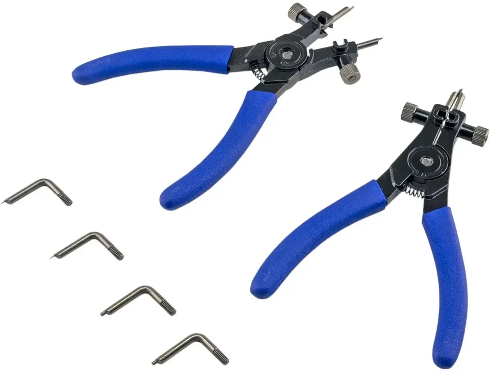 - В комплекте четыре пары сменных наконечника из закаленной стали различного диаметра (0.8, 1.2, 1.4, 2.0 мм) - для монтажа различных типоразмеров стопорных колец.